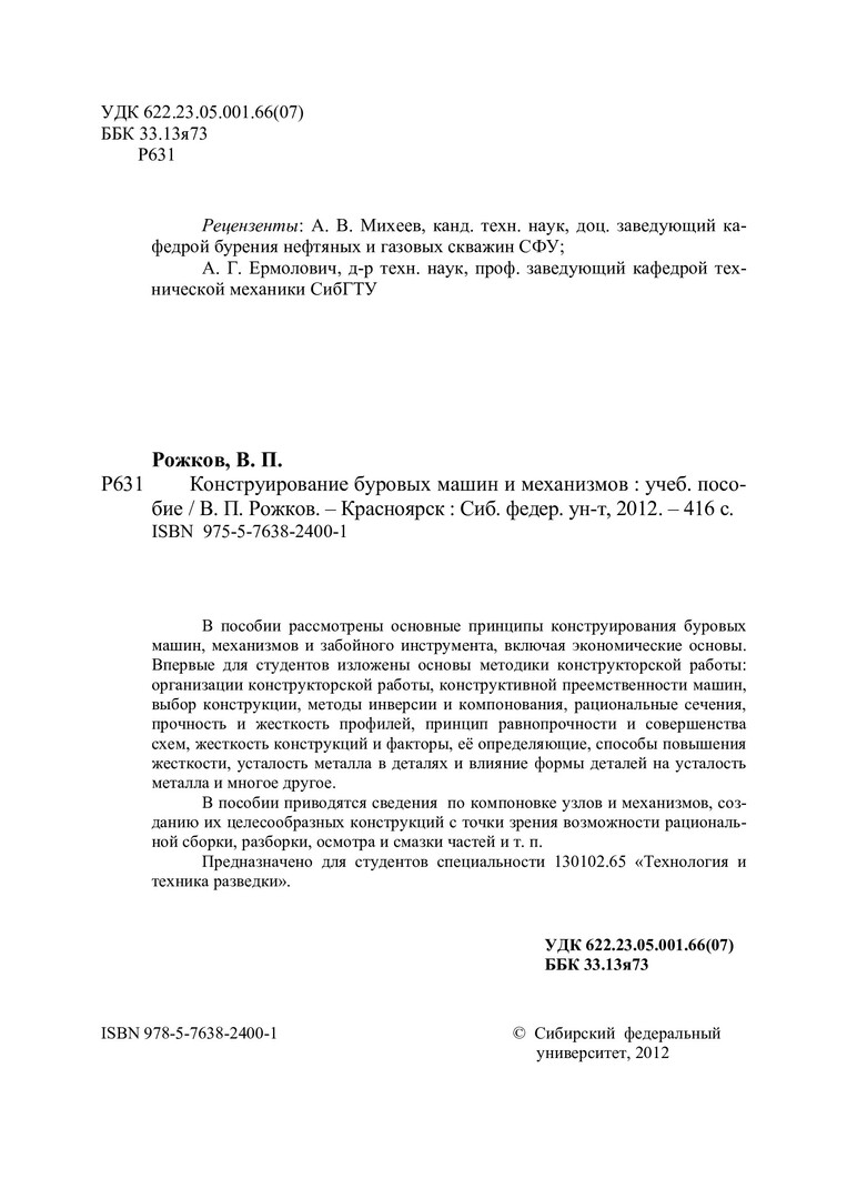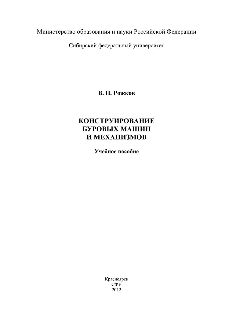Библиографическое описание: Рожков, Владимир Павлович. Конструирование буровых машин и механизмов : учеб. пособие [по спец. 130102.65 "Технология и техника разведки"] / В. П. Рожков ; Сиб. федер. ун-т, Ин-т цвет. металлов и материаловедения. - Красноярск : СФУ, 2012. - 413 с. : ил. - Библиогр.: с.409-410 . - ISBN 978-5-7638-2400-1 : 270.00 р., 568.00 р. - Изд. № 2012-4863. - Текст : непосредственный + Текст : электронный.