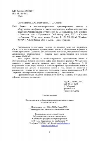 Библиографическое описание:Расчет и автоматизированное проектирование машин и оборудования нефтяных и газовых промыслов : учеб-метод. пособие по решению задач для студентов спец. 13.06.02 «Машины и оборудование нефтяных и газовых промыслов». / Сиб. федерал. ун-т ; сост.: Д. О. Макушкин, Т. С. Спирин. - Электрон. текстовые дан. (PDF, 1,1 Мб). - Красноярск : СФУ, 2012. - Загл. с титул. экрана. - Библиогр. в конце разд. - Текст : электронный.
