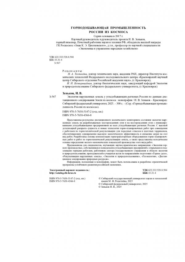 Библиографическое описание: Зеньков, Игорь Владимирович. Экология нарушенных земель в угледобывающих регионах России по данным дистанционного зондирования Земли из космоса : монография / И. В. Зеньков ; рец.: Н. А. Тестоедов, И. Н. Безкоровайная ; Сибирский федеральный университет, Институт нефти и газа. - Электрон. текстовые дан. (pdf, 42.1 Мб). - Красноярск : СФУ, печ.2025-06-30. - 300 с. : граф., цв. ил., табл. - Загл. с титул. экрана. - Библиогр.: с. 284-296. - 1000 экз. - ISBN 978-5-7638-5147-2 : Б. ц. - Изд. № 2025-24691. - Текст : электронный.