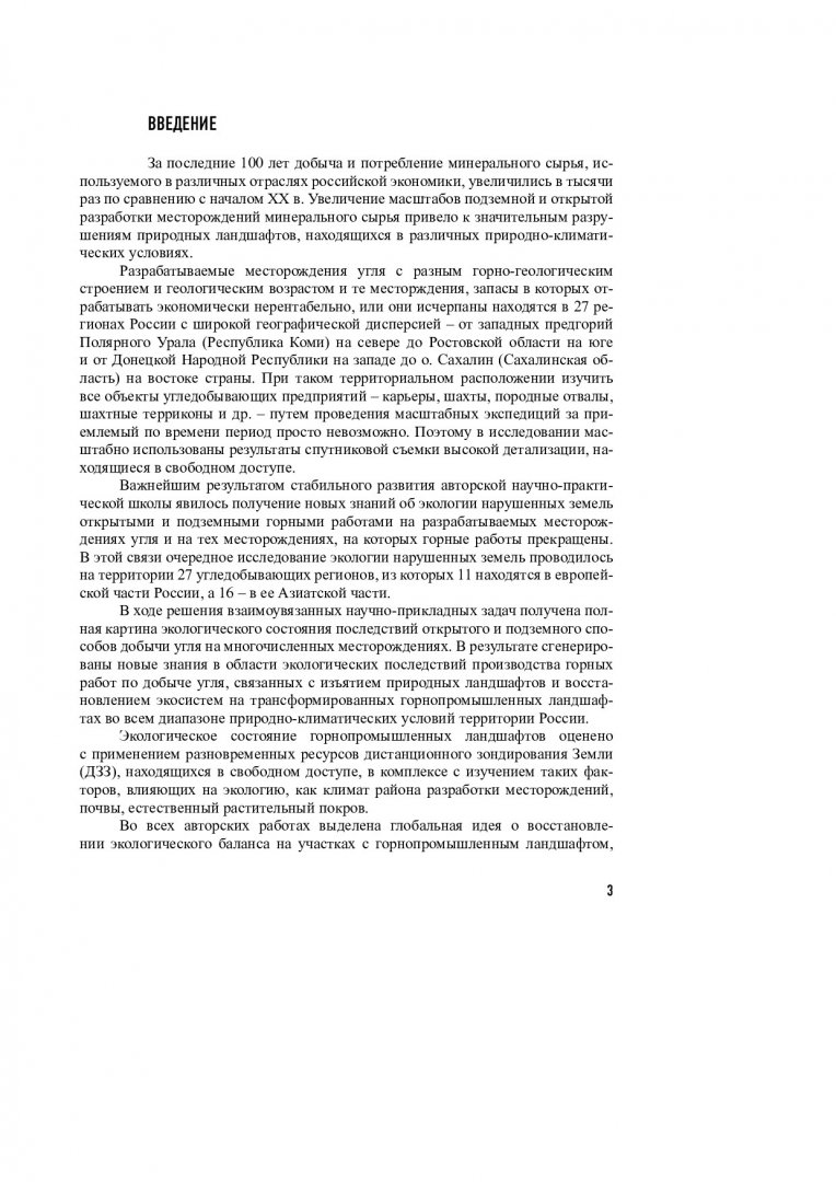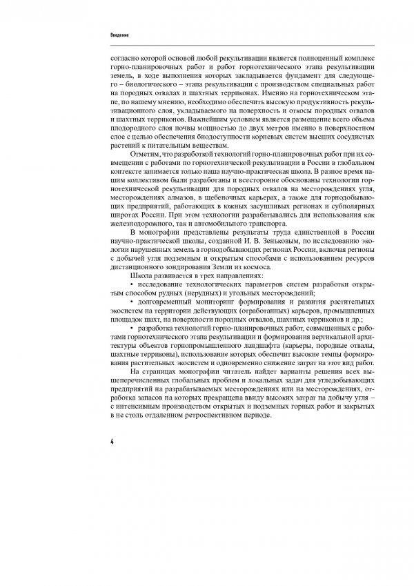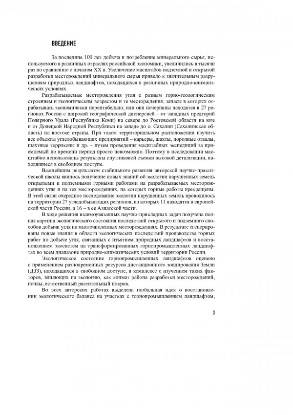 Аннотация: Представлены результаты дистанционного космического мониторинга состояния экологии нарушенных земель на разрабатываемых месторождениях угля и на месторождениях угля с ликвидированными угледобывающими предприятиями во всех угледобывающих регионах России. С высокой детализацией раскрыта сущность и новые технологии горно-планировочных работ при совмещении с работами по горнотехнической рекультивации для породных отвалов и шахтных терриконов, обеспечивающих одновременно высокую экологическую эффективность и снижение затрат на этот вид работ. Разработаны основы комплектации горнотранспортным оборудованием горно-планировочных работ и работ по горнотехнической рекультивации земель, а также представлены методические основы определения эколого-экономических показателей производства этого вида работ. Предназначена для специалистов, изучающих научно-практическое направление «Экология горного производства», собственников и менеджмента угледобывающих предприятий с открытыми и подземными горными работами, работников сектора государственного управления в области экологии и природопользования, преподавателей и учащихся вузов по направлениям подготовки «Горное дело», «Рекультивация нарушенных земель», «Экология и природопользование», «Геоэкология», «Дистанционное зондирование природных ресурсов». Информация, изложенная в монографии, может быть использована в разработке стратегической программы устойчивого развития российской экономики.