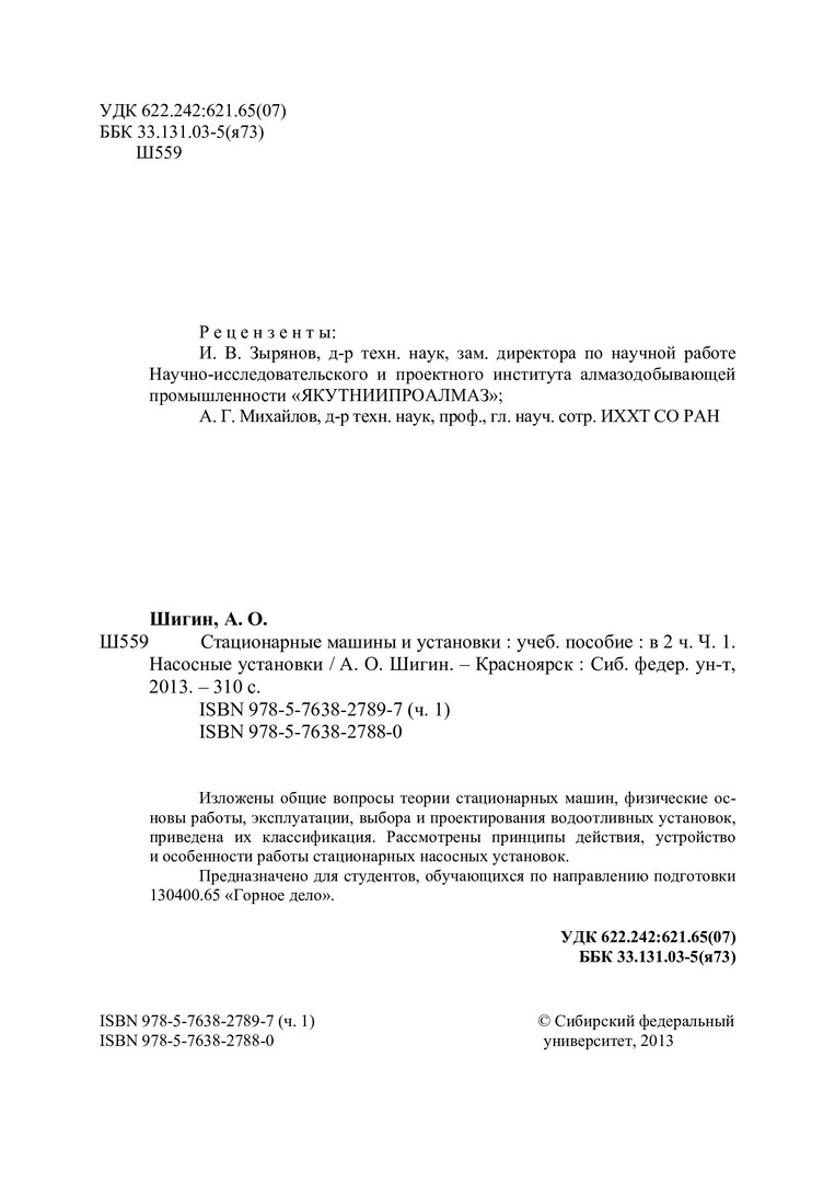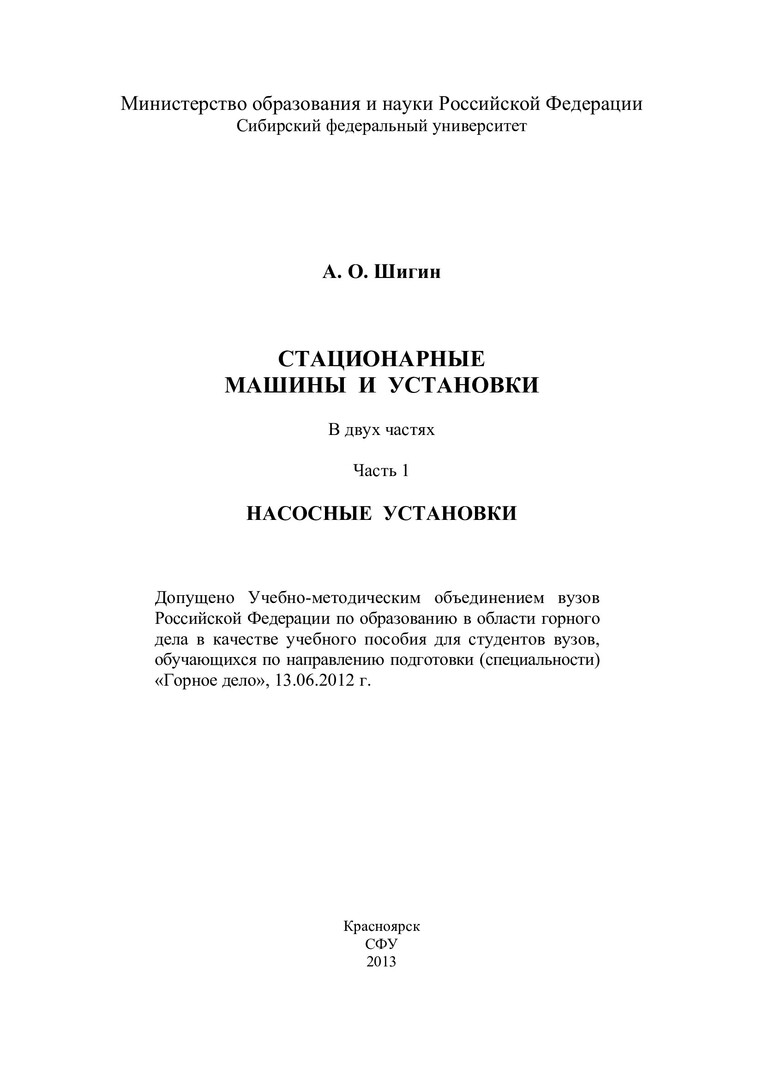 Библиографическое описание:Шигин, Андрей Олегович. Стационарные машины и установки : в 2-х ч. : учебное пособие для вузов по напр. подготовки (специальности) "Горное дело" / А. О. Шигин ; Сиб. федер. ун-т, Ин-т горного дела, геологии и геотехнологий. - Красноярск : СФУ, 2013 - . - ISBN 978-5-7638-2788-0. - Текст : непосредственный. + Текст : электронный. Ч. 1 : Насосные установки. - 2013. - 327 с. : ил., схем. - Библиогр.: с.318-325 . - ISBN 978-5-7638-2789-7