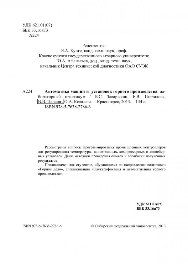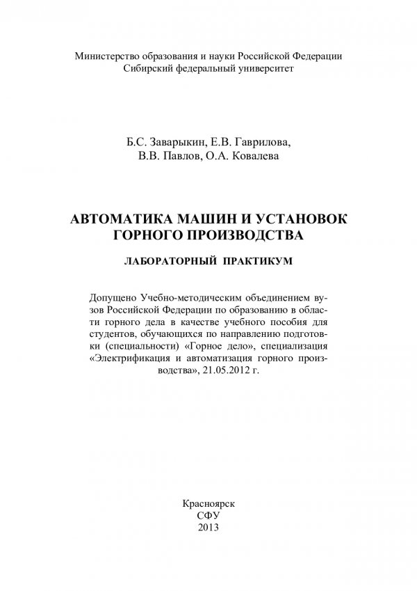 Библиографическое описание:Автоматика машин и установок горного производства: лабораторный практикум : учеб. пособие по направ. подг. "Горное дело", спец. "Электрификация и автоматизация горного производства" / Б. С. Заварыкин, Е. В. Гаврилова [и др.] ; Сиб. федерал. ун-т, Ин-т горного дела, геологии и геотехнологий. - Красноярск : СФУ, 2013. - 133 с. : ил. - (Горное дело). - ISBN 978-5-7638-2786-6 : 354.00 р. - Изд. № 2013-889. - Текст : непосредственный + Текст : электронный.