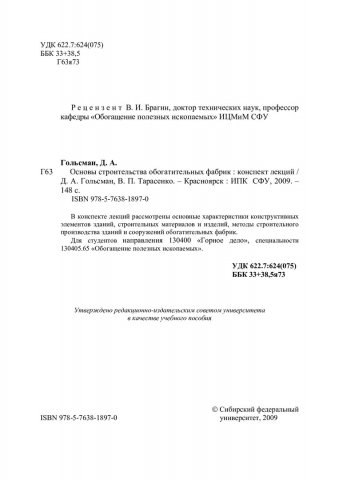 Библиографическое описание:Гольсман, Дмитрий Альбертович. Основы строительства обогатительных фабрик : конспект лекций / Д. А. Гольсман, В. П. Тарасенко ; Сибирский федеральный университет [СФУ]. - Красноярск : Информационно-полиграфический комплекс [ИПК] СФУ, 2009. - 146 с. : ил. - Библиогр. список: с.145. - ISBN 978-5-7638-1897-0 : 101.00 р. - Текст : непосредственный + Текст : электронный.
