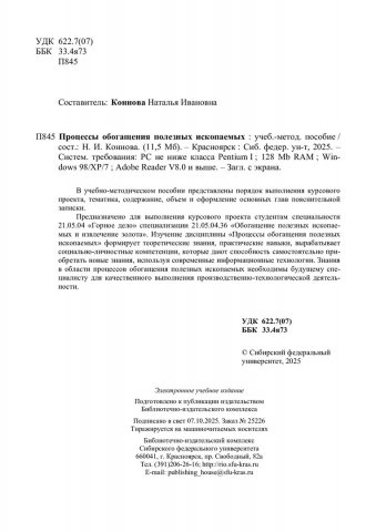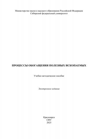 Библиографическое описание: Процессы обогащения полезных ископаемых : учебно-методическое пособие / Сибирский федеральный университет, Институт цветных металлов ; сост. Н. И. Коннова. - Электрон. текстовые дан. (pdf, 10 Мб). - Красноярск : СФУ, 2025 (2025-10-07). - 103 с. - Загл. с титул. экрана. - Библиогр.: с. 38-39. - Изд. № 2025-25226 : Б. ц. - Текст : электронный.