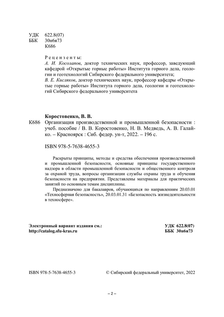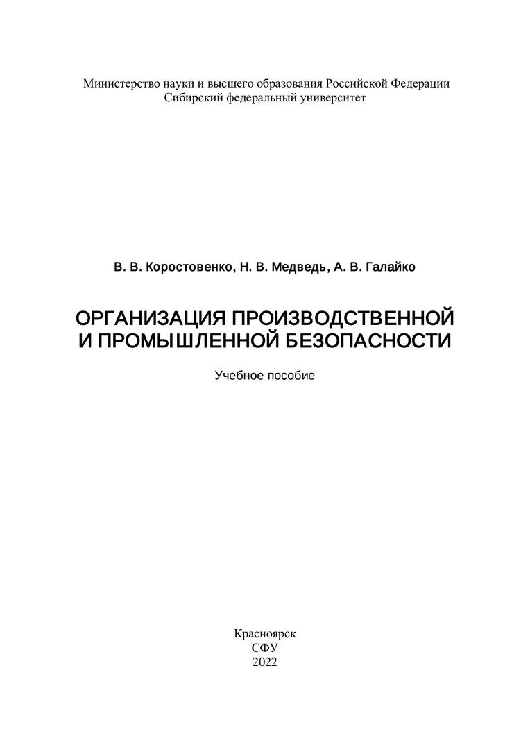 Библиографическое описание: Коростовенко, Вячеслав Васильевич. Организация производственной и промышленной безопасности : учебное пособие / В. В. Коростовенко, Н. В. Медведь, А. В. Галайко ; Сибирский федеральный университет, Институт цветных металлов и материаловедения. - Электрон. текстовые дан. (12,0 Мб). - Красноярск : СФУ, 2022 (2022-08-25). - 196 с., 15.9 усл. печ. л. : табл., цв. ил. - Загл. с титул. экрана. - Электрон. версия печ. публикации . - Библиогр.: с. 192-195. - 100 экз. - ISBN 978-5-7638-4655-3 : Б. ц. - Изд. № 2022-15772. - Текст : электронный.