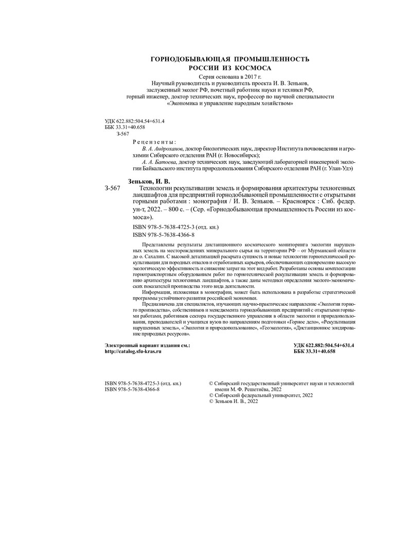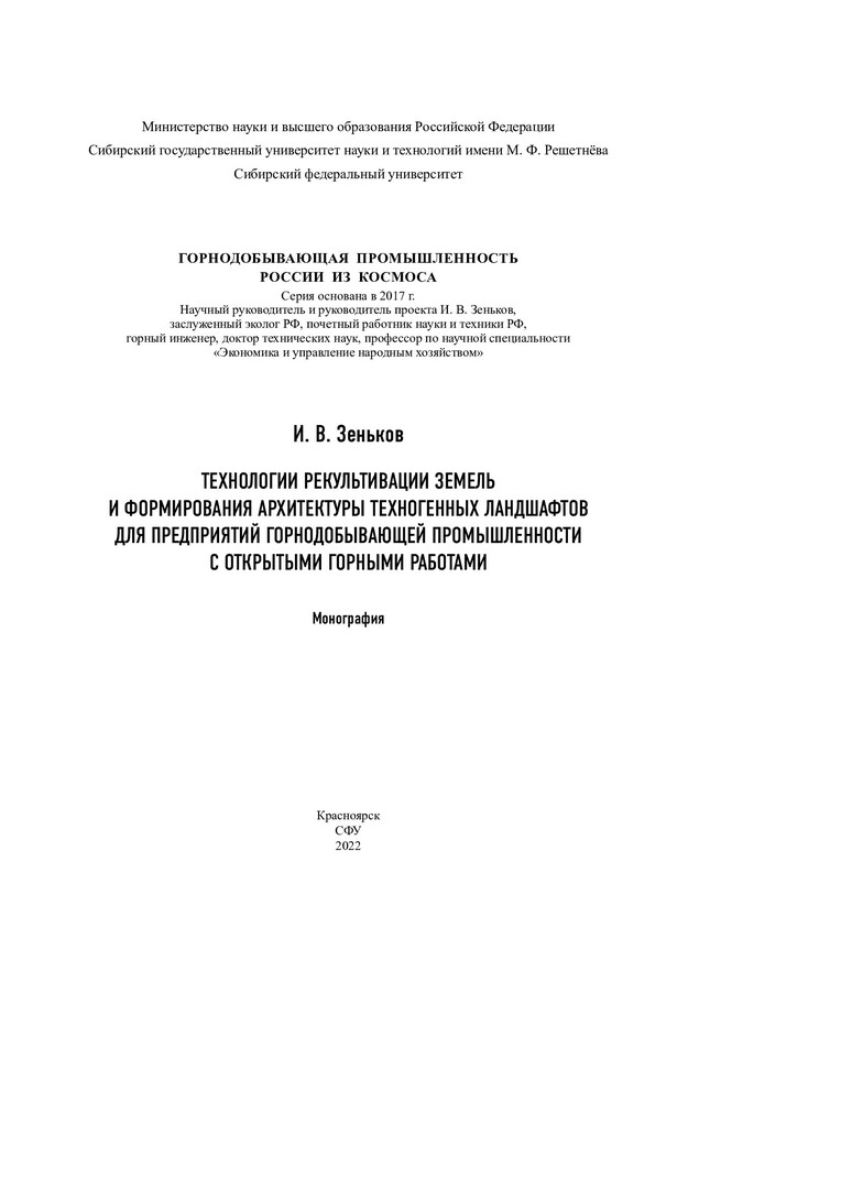 Библиографическое описание: Зеньков, Игорь Владимирович. Технологии рекультивации земель и формирования архитектуры техногенных ландшафтов для предприятий горнодобывающей промышленности с открытыми горными работами : монография / И. В. Зеньков ; Сибирский государственный университет науки и технологий им. М. Ф. Решетнева, Сибирский федеральный университет. - Красноярск : СФУ, 2022 (2022-08-01). - 800 с. : цв. ил., табл., граф. - (Горнодобывающая промышленность России из космоса). - 1000 экз. - ISBN 978-5-7638-4725-3 : Б. ц. - Изд. № 2022-16834. - Текст : непосредственный : электронный.