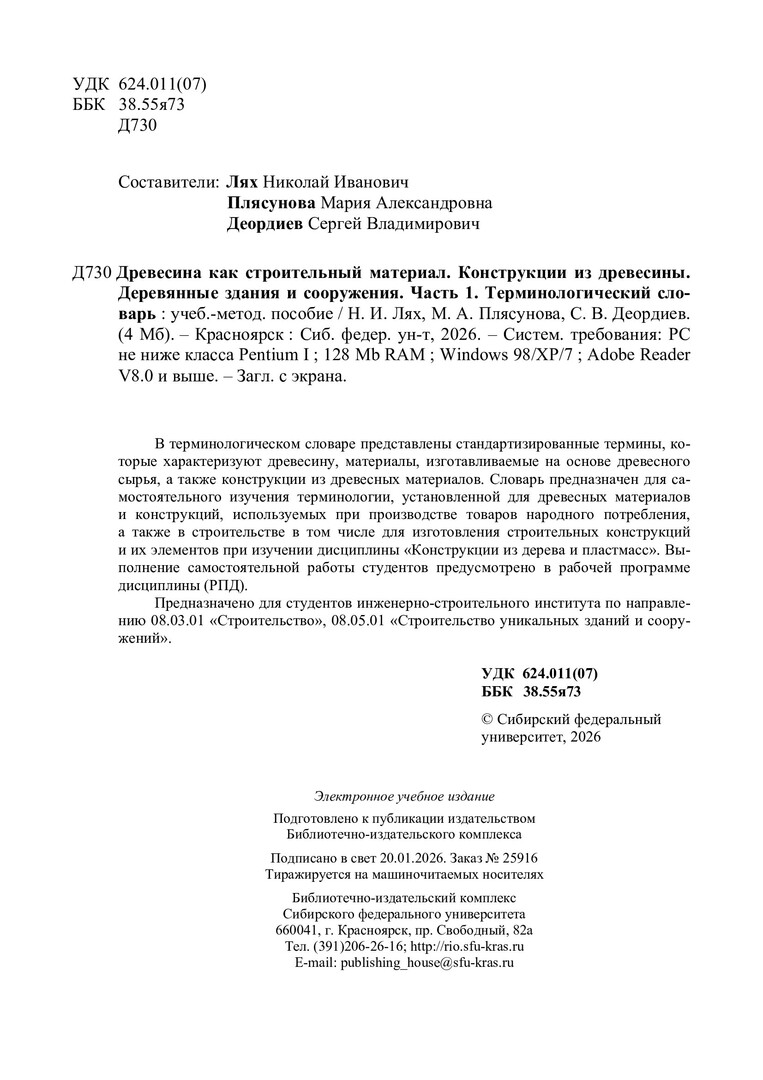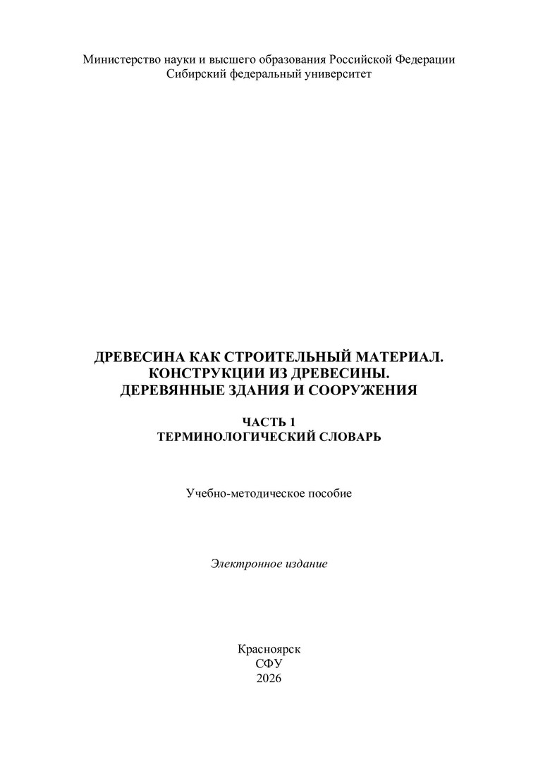 Библиографическое описание: Древесина как строительный материал. Конструкции из древесины. Деревянные здания и сооружения. Часть 1 : учебно-методическое пособие / Сиб. федер. ун-т, Инж.-строит. ин-т ; сост.: Н. И. Лях, М. А. Плясунова, С. В. Деордиев. - Электрон. текстовые дан. (pdf, 4.7 Мб). - Красноярск : СФУ, 2026 (2026-01-20). - 86 с. - Загл. с титул. экрана. - Изд. № 2025-25916 : Б. ц. - Текст : электронный.