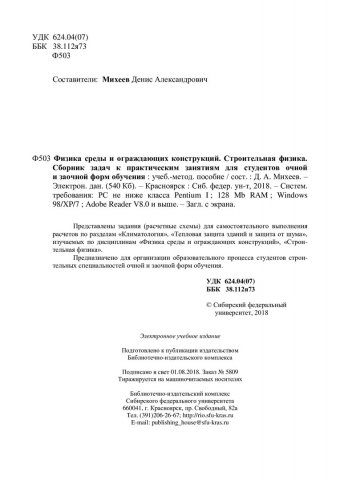 Библиографическое описание:Физика среды и ограждающих конструкций. Строительная физика. Сборник задач к практическим занятиям для студентов очной и заочной форм обучения : учебно-методическое пособие / Сиб. федер. ун-т, Инж.-строит. ин-т ; сост. Д. А. Михеев. - Электрон. текстовые дан. (pdf, 4,3 Мб). - Красноярск : СФУ, 2018. - Загл. с титул. экрана. - Библиогр.: с. 41. - Изд. № 2018-5809 : Б. ц. - Текст : непосредственный.