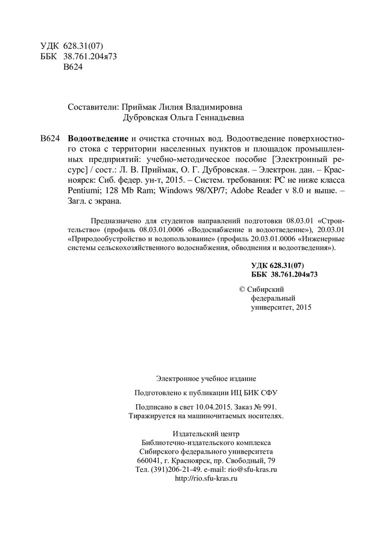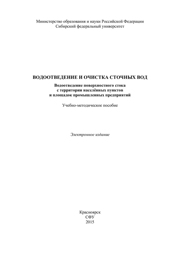 Библиографическое описание:Водоотведение и очистка сточных вод. Водоотведение поверхностного стока с территории населенных пунктов и площадок промышленных предприятий : учебно-методическое пособие [для студентов напр. подг. 08.03.01 «Строительство» (профиль 08.03.01.0006 «Водоснабжение и водоотведение»), 20.03.01 «Природообустройство и водопользование» (профиль 20.03.01.0006 «Инженерные системы сельскохозяйственного водоснабжения, обводнения и водоотведения»)] / Сиб. федер. ун-т, Инж.-строит. ин-т ; сост.: Л. В. Приймак, О. Г. Дубровская. - Электрон. текстовые дан. (PDF, 698 Кб). - Красноярск : СФУ, 2015. - Загл. с титул. экрана. - Библиогр.: с. 39. - Изд. № 2015-991. - Текст : электронный.