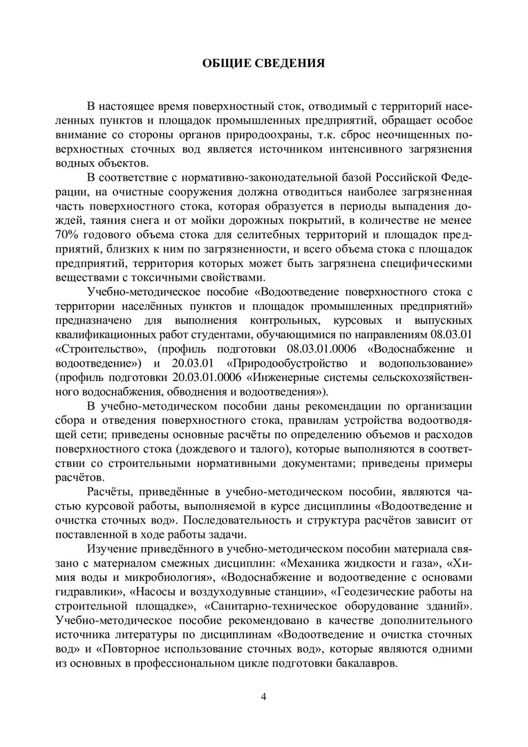 Ключевые слова:сточные воды, поверхностный сток, водоотводящие сети, дождевые и талые сточные воды, поверхностный сток промышленных площадок, объемы и расходы поверхностного стока, учебно-методические пособия