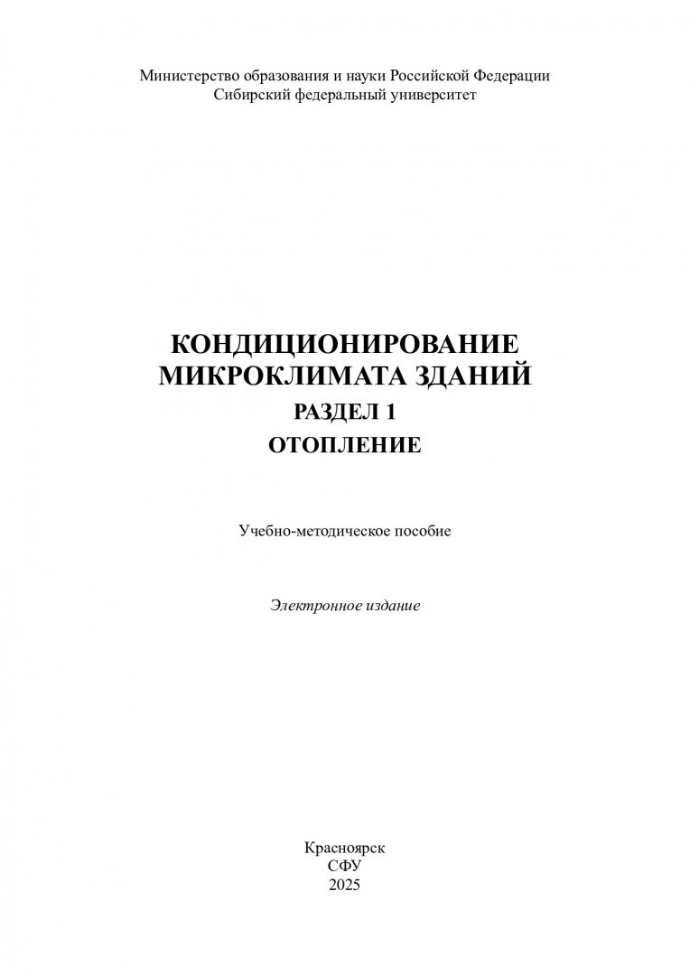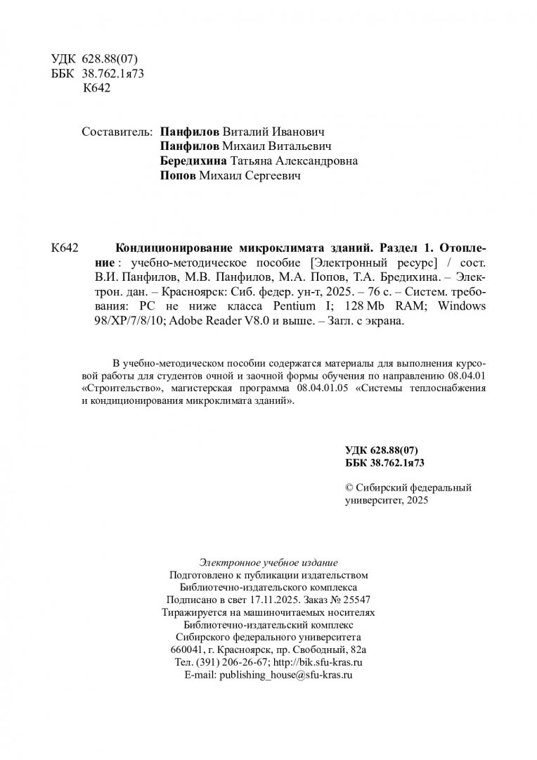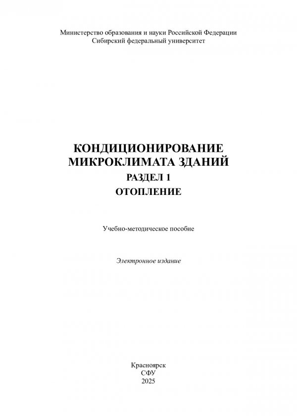 Библиографическое описание:Кондиционирование микроклимата зданий : Раздел 1: Отопление : учебно-методическое пособие / Сибирский федеральный университет, Инженерно-строительный институт ; :сост. В. И. Панфилов, М. В. Панфилов, Т. А. Бередихина, М. С. Попов . - Электрон. текстовые дан. (pdf, 3.6 Мб). - Красноярск : СФУ, 2025. - 76 с. - Загл. с титул. экрана. - Библиогр.: с. 60-62. - Изд. № 2025-25547 : Б. ц. - Текст : электронный.