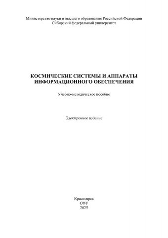 Библиографическое описание: Космические системы и аппараты информационного обеспечения : учебно-методическое пособие / Сибирский федеральный университет, Институт космических и информационных технологий ; сост.: В. Е. Чеботарев, Е. С. Сидорова, А. А. Внуков. - Электрон. текстовые дан. (pdf, 4 Мб). - Красноярск : СФУ, 2025 (2025-0910). - 138 с. - Загл. с титул. экрана. - Библиогр.: с. 136. - Изд. № 2025-24962 : Б. ц. - Текст : электронный.