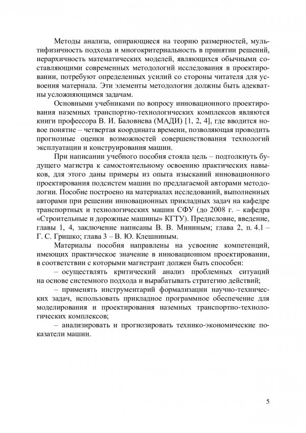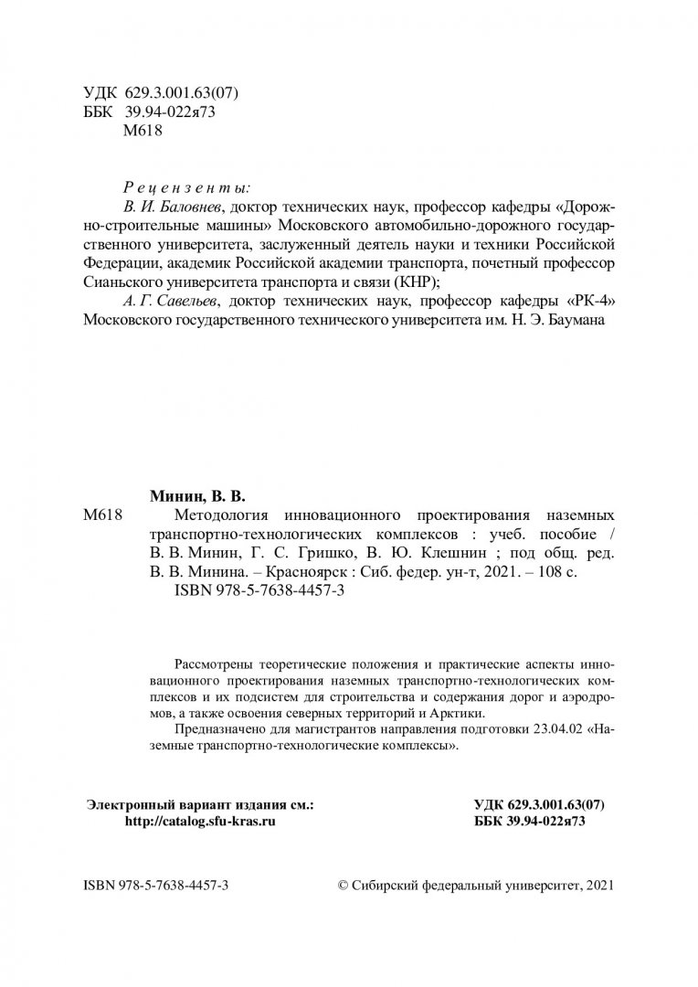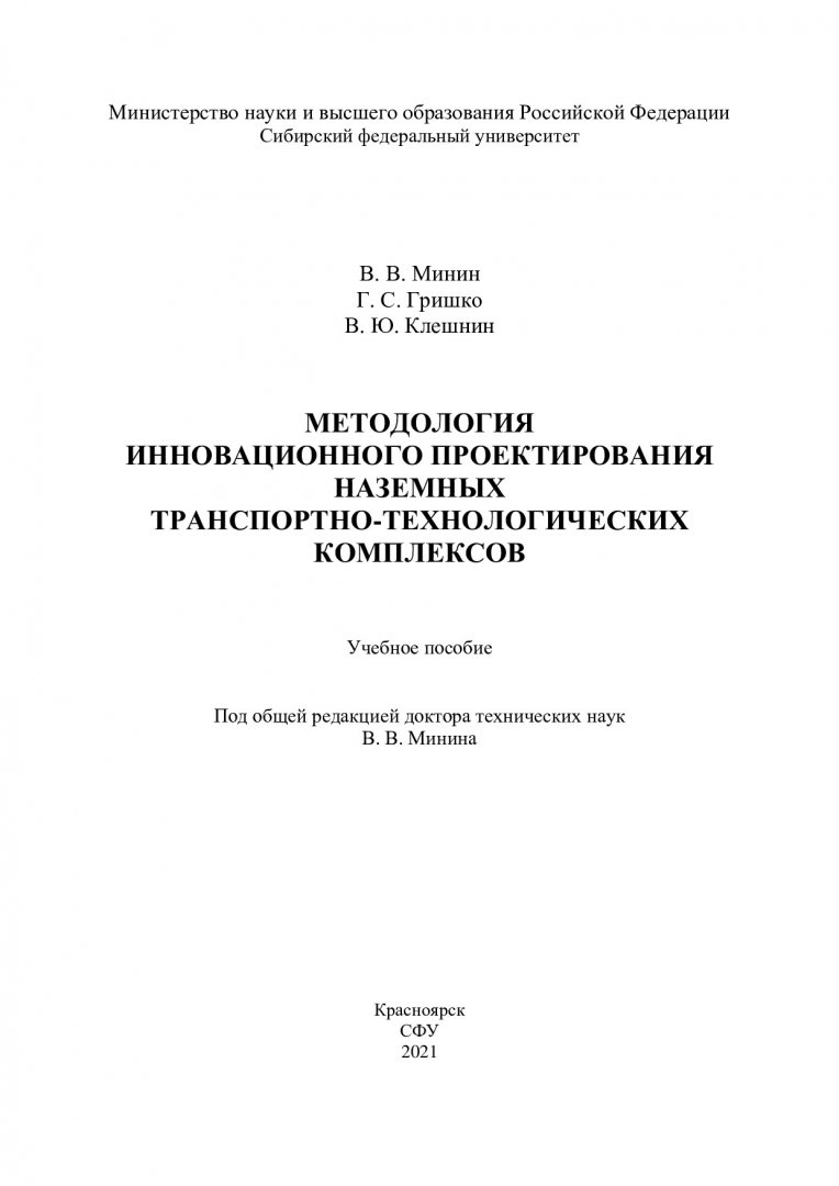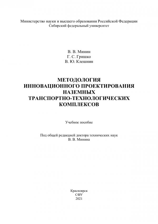 Библиографическое описание: Минин, Виталий Васильевич. Методология инновационного проектирования наземных транспортно-технологических комплексов : учебное пособие / В. В. Минин, Г. С. Гришко, В. Ю. Клешнин ; Сиб. федер. ун-т, Политехн. ин-т. - Красноярск : СФУ, 2021 (2020-12-29). - 108 с. : ил., табл. - Библиогр.: с. 107. - 500 экз. - ISBN 978-5-7638-4457-3 : 225.00 р. - Изд. № 2020-12749. - Текст : непосредственный : электронный.
