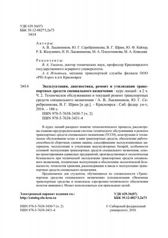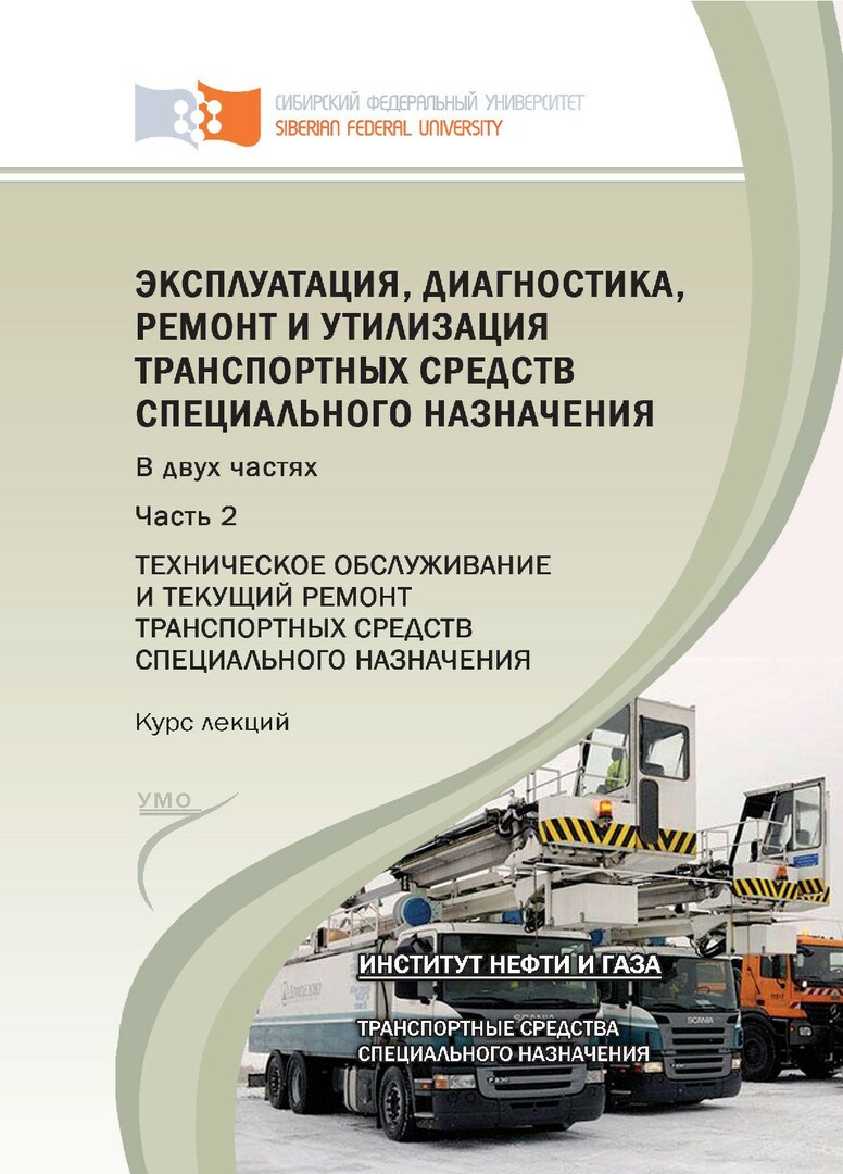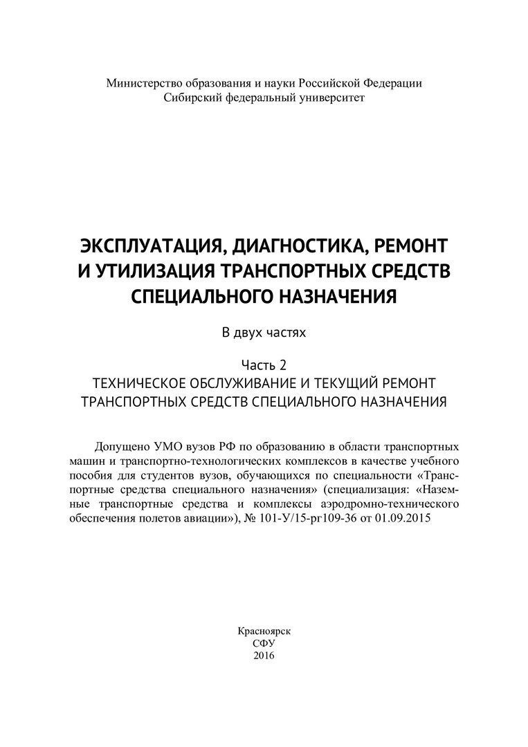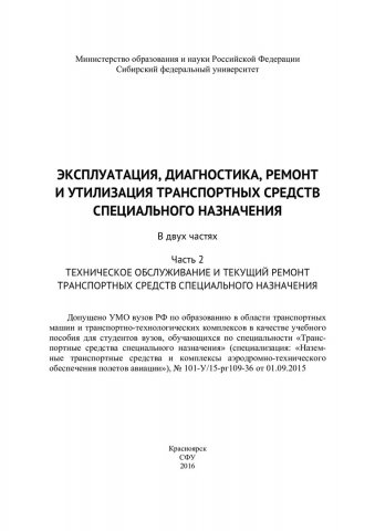 Библиографическое описание:Эксплуатация, диагностика, ремонт и утилизация транспортных средств специального назначения : курс лекций: учебное пособие для студентов вузов, обучающихся по специальности "Транспортные средства специального назначения": в 2-х ч. / А. В. Лысянников [и др.] ; Сиб. федер. ун-т, Ин-т нефти и газа. - Красноярск : СФУ, 2016. - ISBN 978-5-7638-3431-4. - Текст : непосредственный. + Текст : электронный. Ч. 2 : Технология технического обслуживания транспортных средств специального назначения. - 2016. - 185 с. : ил., табл. - Библиогр.: с. 183-185. - 100 экз. - ISBN 978-5-7638-3430-7 : 462.00 р. - Изд. № 2016-625