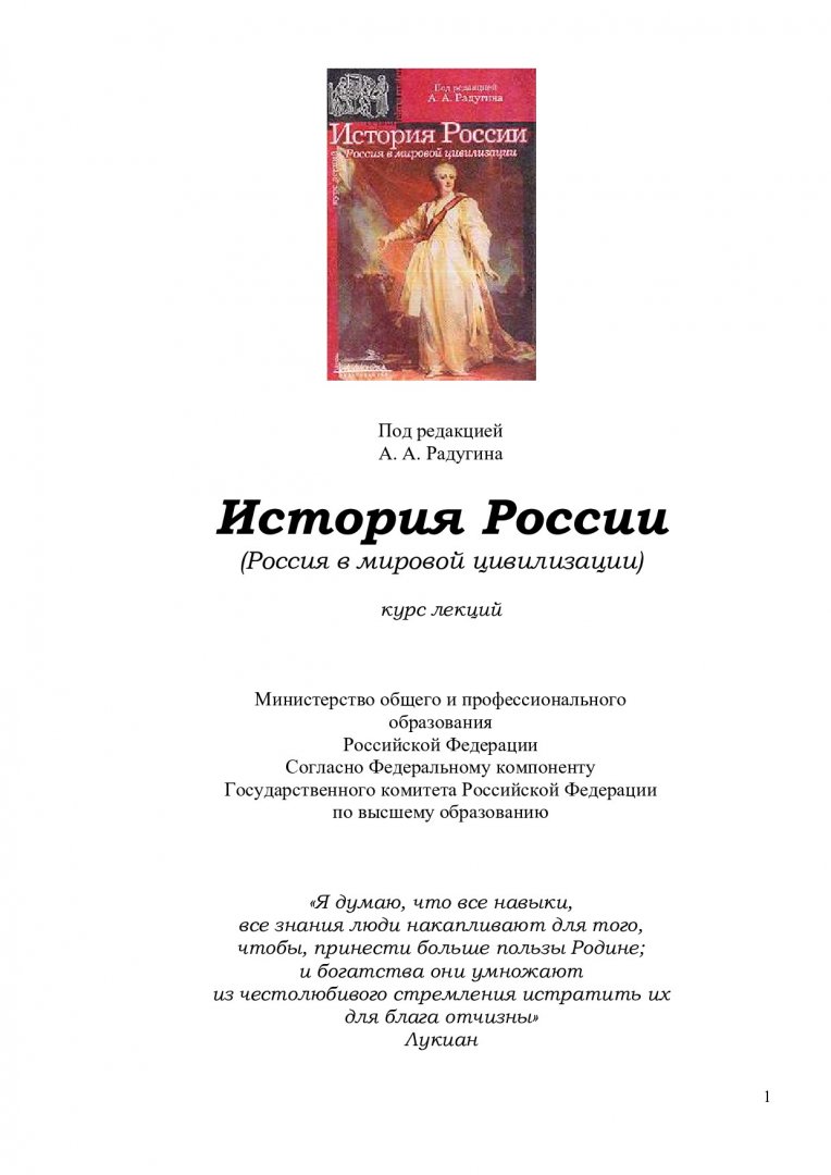 Библиографическое описание:История России (Россия в мировой цивилизации) : курс лекций / под ред. А. А. Радугин. - Москва : Центр, 2001. - (Alma mater). - ISBN 5-88860-016-4 : Б. ц. - Текст : электронный. Режим доступа: читальные залы НБ СФУ