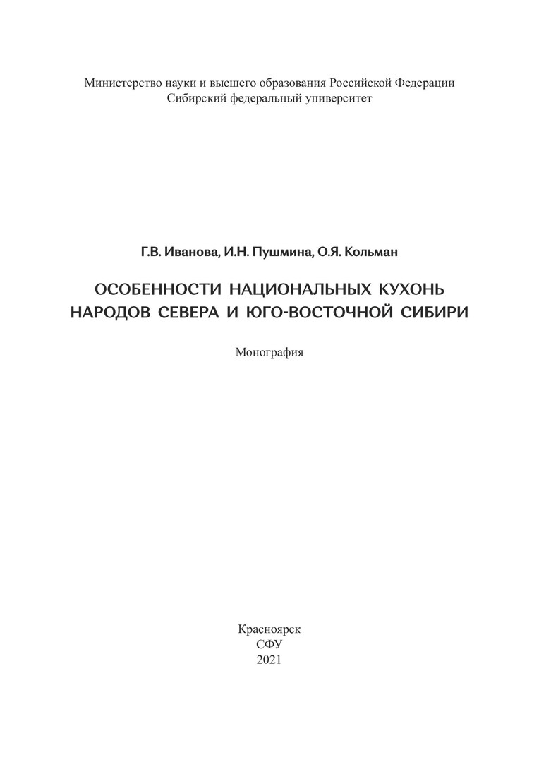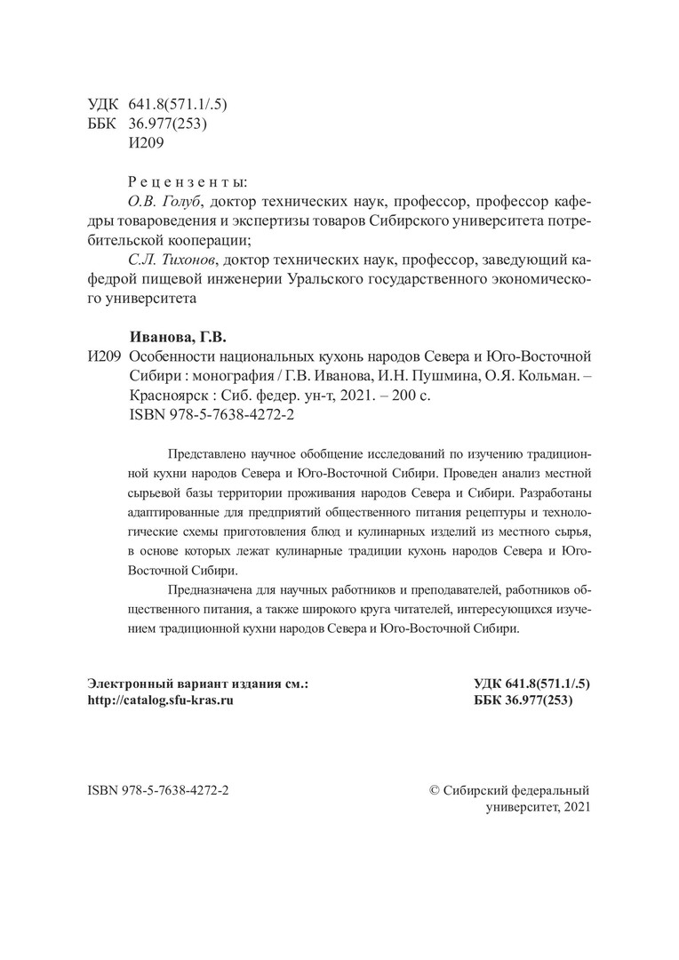 Библиографическое описание: Иванова, Галина Валентиновна. Особенности национальных кухонь народов Севера и Юго-Восточной Сибири : монография / Г. В. Иванова, И. Н. Пушмина, О. Я. Кольман ; рец.: О. В. Голуб, С. Л. Тихонов ; Сибирский федеральный университет, Институт торговли и сферы услуг. - Красноярск : СФУ, 2021 (2021-06-08). - 200 с., 12.5 усл. печ. л. : ил., табл. - Библиогр.: с. 105-106. - 500 экз. - ISBN 978-5-7638-4272-2 : 497.00 р. - Изд. № 2020-10978. - Текст : непосредственный : электронный.