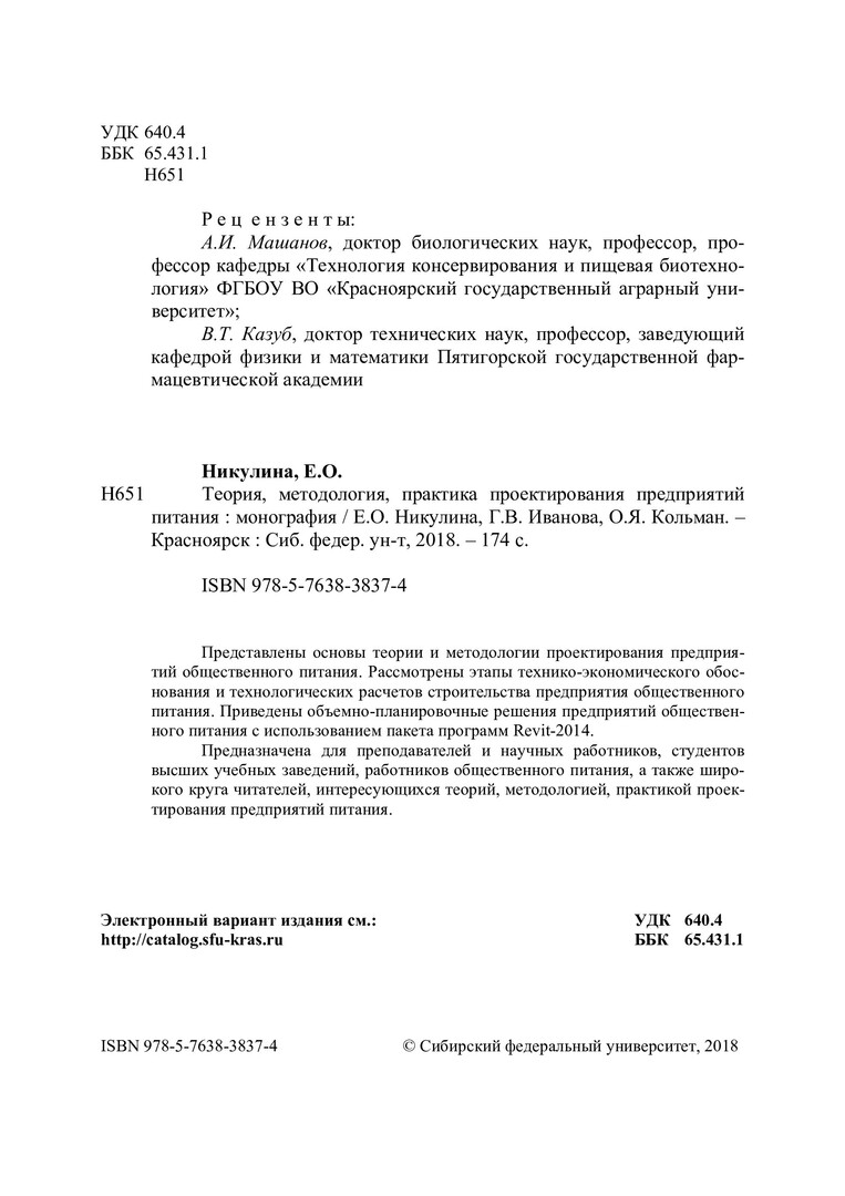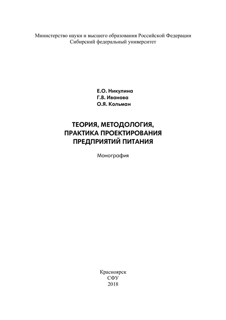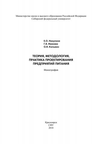 Библиографическое описание: Никулина, Екатерина Олеговна. Теория, методология, практика проектирования предприятий питания : монография / Е. О. Никулина, Г. В. Иванова, О. Я. Кольман ; Сиб. федер. ун-т, Торг.-эконом. ин-т. - Красноярск : СФУ, 2018. - 172 с. : табл., цв. ил., схемы. - Библиогр.: с. 128-131. - 500 экз. - ISBN 978-5-7638-3837-4 : 364.00 р. - Изд. № 2017-3851. - Текст : непосредственный + Текст : электронный.