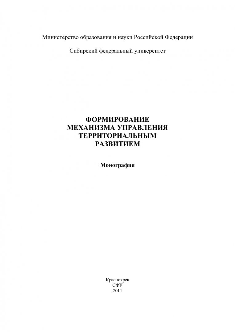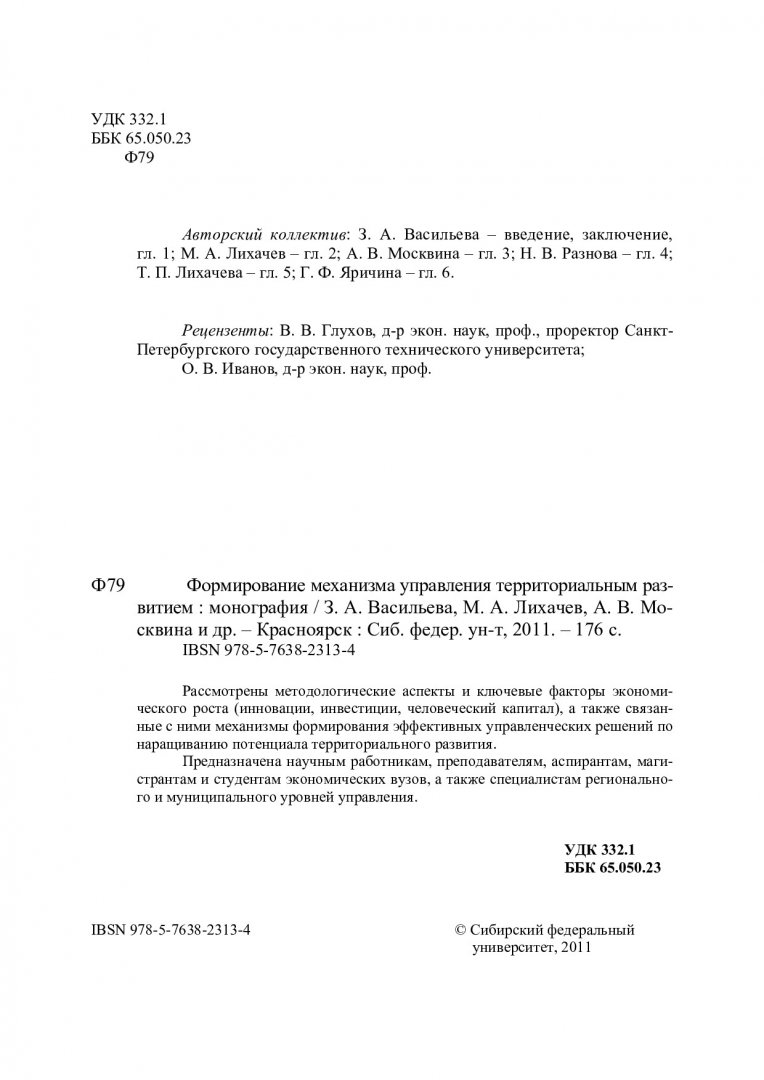 Библиографическое описание: Формирование механизма управления территориальным развитием : монография / З. А. Васильева, М. А. Лихачев [и др.]. ; Сиб. федерал. ун-т, Ин-т. управления бизнес-процессами и экономики. - Красноярск : СФУ, 2011. - 174 : ил., табл. - Библиогр.: с. 167-172. - ISBN 978-5763-82313-4. - Текст : непосредственный + Текст : электронный.