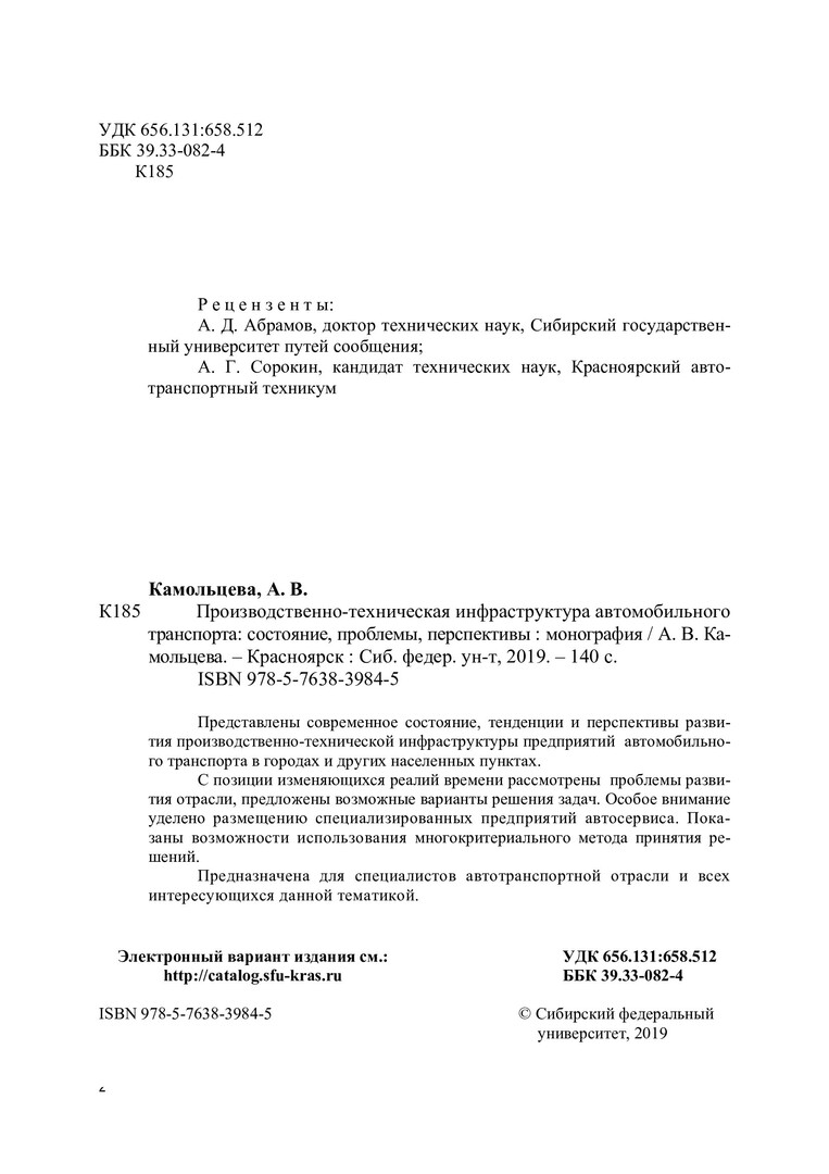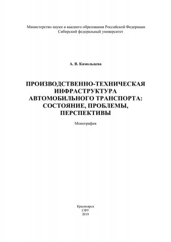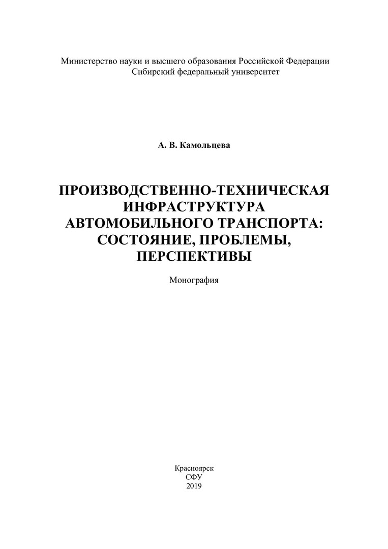 Библиографическое описание: Камольцева, Алла Владимировна. Производственно-техническая инфраструктура предприятий автомобильного транспорта. Состояние, проблемы, перспективы : монография / А. В. Камольцева ; Сиб. федер. ун-т, Политехн. ин-т. - Красноярск : СФУ, 2019 (2019-09-30). - 139 с. : цв .ил., табл., граф. - Библиогр.: с. 136-139. - 500 экз. - ISBN 978-5-7638-3984-5 : 426.00 р. - Изд. № 2018-6101. - Текст : непосредственный + Текст : электронный.