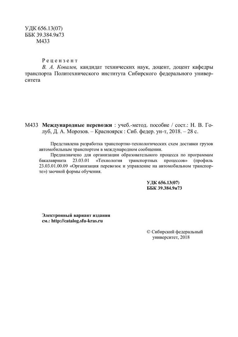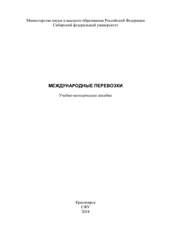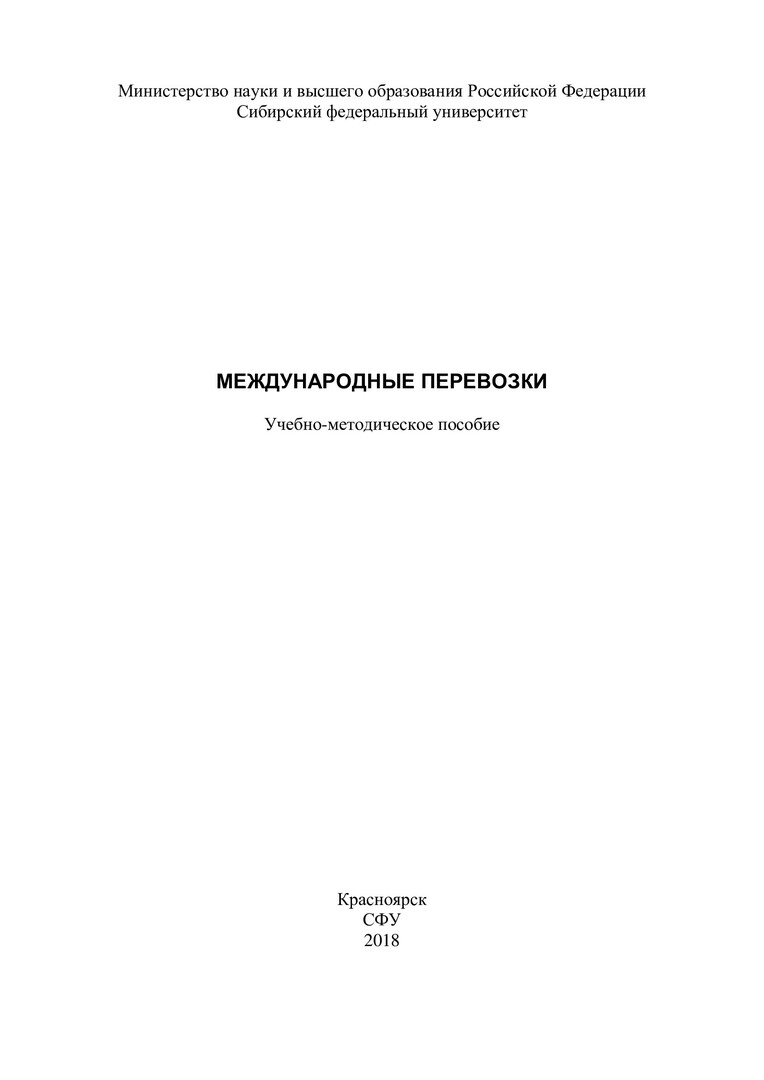 Библиографическое описание: Международные перевозки : учебно-методическое пособие / Сиб. федер. ун-т, Политехн. ин-т ; сост.: Н. В. Голуб, Д. А. Морозов. - Красноярск : СФУ, 2018. - 24 с. - 100 экз. - Изд. № 2018-7293 : 53.00 р. - Текст : непосредственный + Текст : электронный.