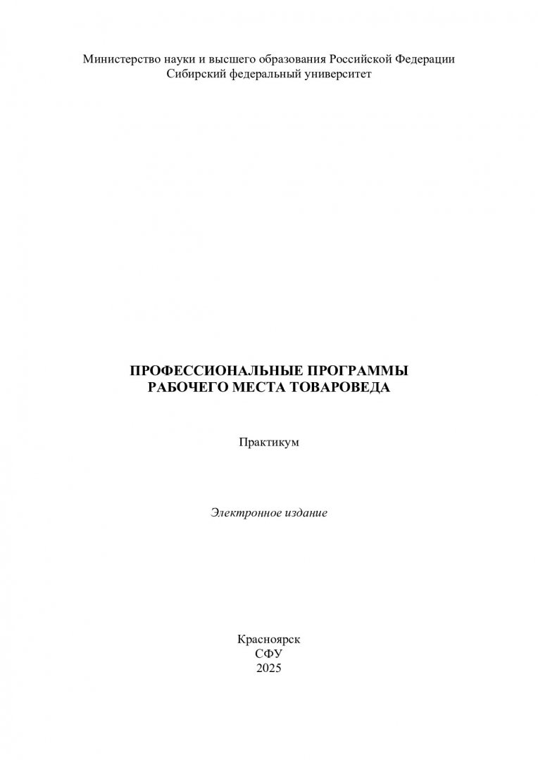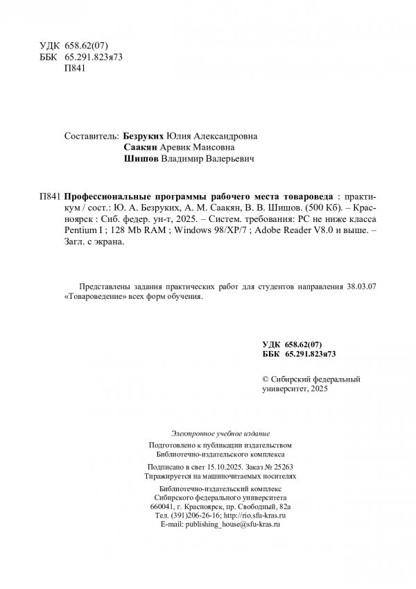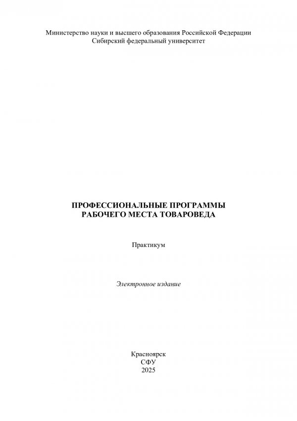 Библиографическое описание:Профессиональные программы рабочего места товароведа : практикум / Сибирский федеральный университет, Институт торговли и сферы услуг ; сост.: Ю. А. Безруких, А. М. Саакян, В. В. Шишов. - Электрон. текстовые дан. (pdf, 2.5 Мб). - Красноярск : СФУ, 2025 (2025-10-15). - 43 с. - Загл. с титул. экрана. - Библиогр.: с. 43. - Изд. № 2025-25263 : Б. ц. - Текст : электронный.