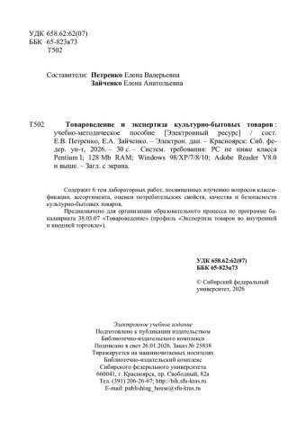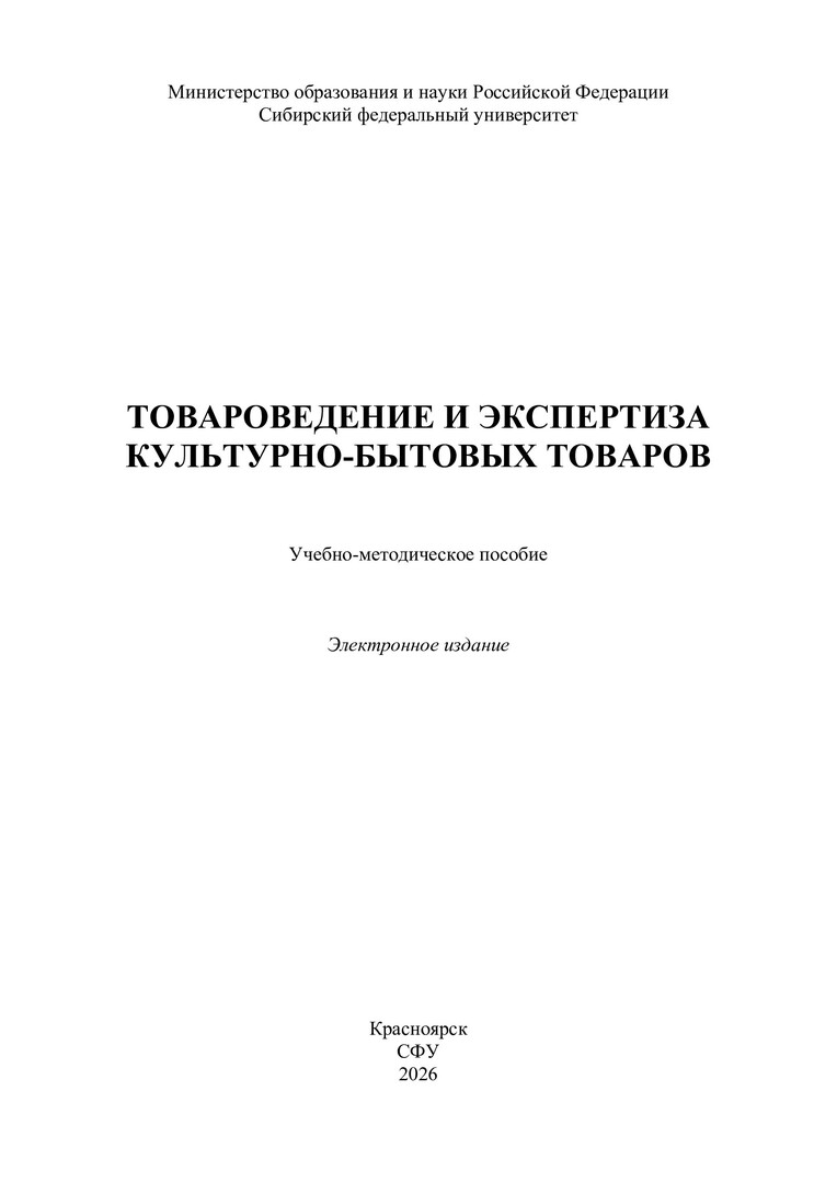 Библиографическое описание:Товароведение и экспертиза культурно-бытовых товаров : [лабораторные работы] : учебно-методическое пособие / Сибирский федеральный университет, Институт торговли и сферы услуг ; сост.: Е. В. Петренко, Е. А. Зайченко. - Электрон. текстовые дан. (pdf, 1.1 Мб). - Красноярск : СФУ, 2026 (2026-01-26). - 30 с. : рис., табл. - Загл. с титул. экрана. - Изд. № 2025-25838 : Б. ц. - Текст : электронный.