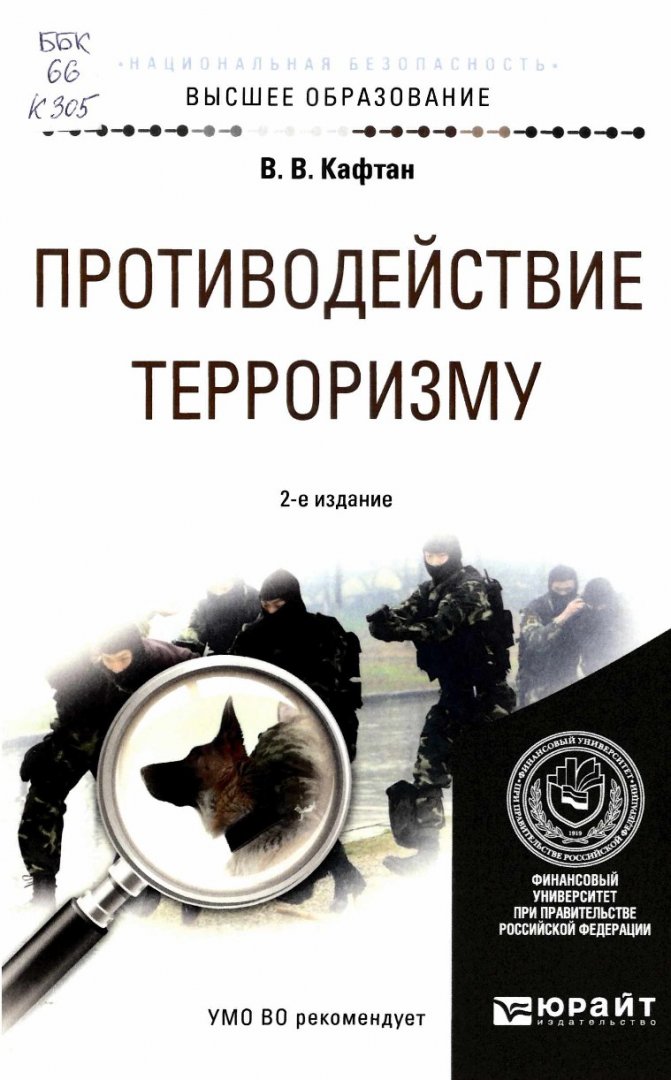Библиографическое описание: Кафтан, Виталий Викторович. Противодействие терроризму : учебное пособие для вузов : учебное пособие для студентов вузов, обучающихся по гуманитарным и юридическим направлениям и специальностям / В. В. Кафтан ; [рец.: С. Н. Климов, П. В. Петрий] ; Финансовый университет при правительстве Российской Федерации. - 2-е изд., испр. и доп. - Москва : Юрайт, 2024. - 261 с. : табл., ил. - (Высшее образование. Национальная безопасность). - Библиогр. в конце разд. и в подстроч. примеч. - ISBN 978-5-534-00322-2 (в пер.) : 482.85 р. - Текст : непосредственный. На тит. л. в подзаг.: Курс с практическими заданиями и дополнительными материалами доступен на образовательной платформе "Юрайт", а также в мобильном приложении "Юрайт.Библиотека"