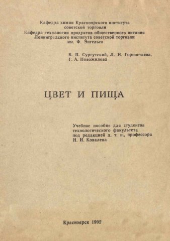 Библиографическое описание: Сургутский, Виталий Петрович. Цвет и пища : учебное пособие для студентов технологического факультета / В. П. Сургутский, Л. И. Горностаева, Г. А. Новожилова ; ред. Н. И. Ковалева ; Красноярский институт советской торговли, Кафедра химии, Ленинградский институт советской торговли им. Ф. Энгельса, Кафедра технологии продуктов общественного питания. - Электрон. текстовые дан. (pdf, 20,4 Мб). - Красноярск : [б. и.], 1992. - 67 с. : ил. - Загл. с титул. экрана. - Электрон. версия печ. публикации . - 38.00 р. - Текст : электронный.