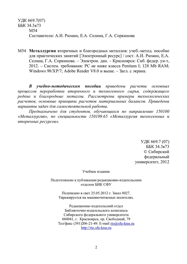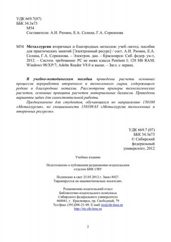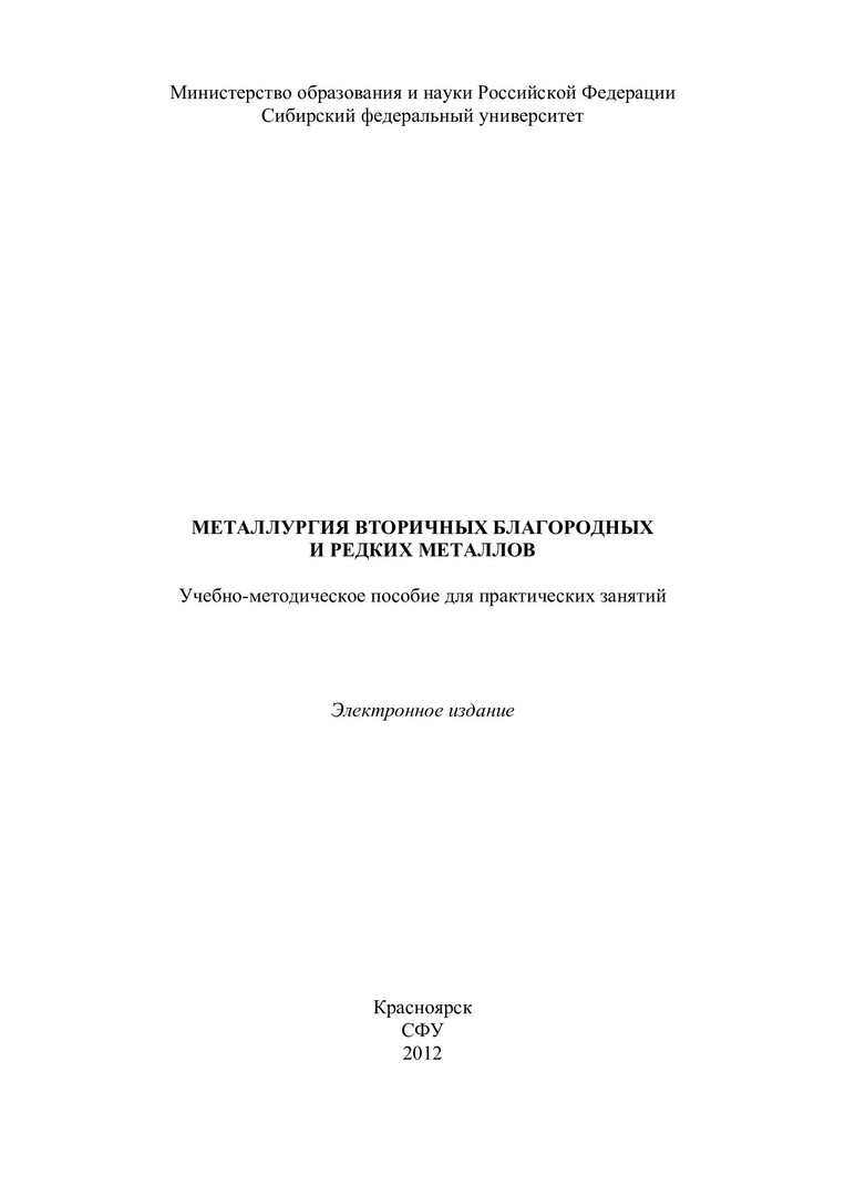 Библиографическое описание:Металлургия вторичных благородных и редких металлов : учеб.-метод. пособие для практ. занятий [для студентов спец. 150109.65 «Металлургия техногенных и вторичных ресурсов»] / Сиб. федерал. ун-т ; сост.: А. И. Рюмин, Е. А. Селина, Г. А. Соркинова. - Электрон. текстовые дан. (PDF, 374 Кб). - Красноярск : СФУ, 2012. - Загл. с титул. экрана. - Библиогр.: с. 44. - Текст : электронный.