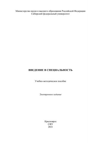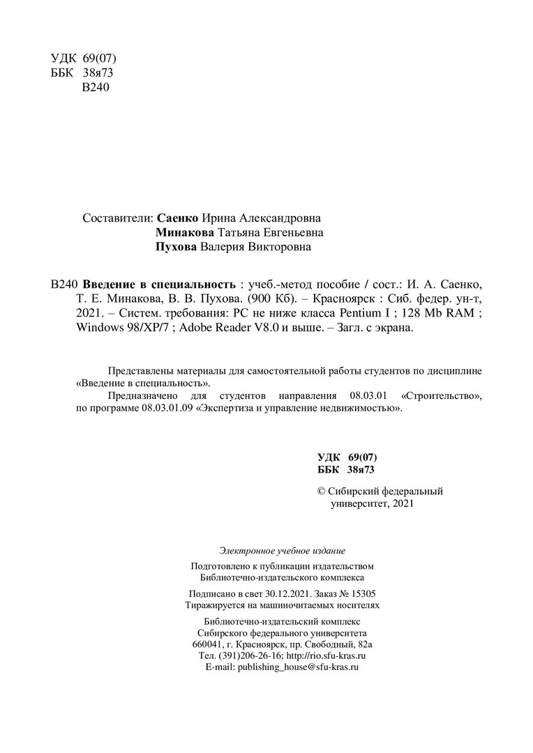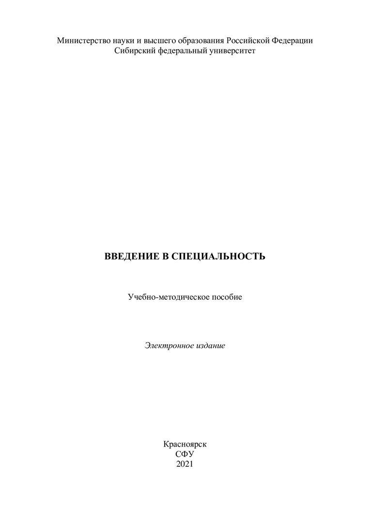 Библиографическое описание: Введение в специальность : учебно-методическое пособие / Сиб. федер. ун-т, Инж.-строит. ин-т ; сост.: И. А. Саенко, Т. Е. Минакова, В. В. Пухова. - Электрон. текстовые дан. (pdf, 0,9 Мб). - Красноярск : СФУ, 2021 (2021-12-20). - 40 с. - Загл. с титул. экрана. - Изд. № 2021-15305 : Б. ц. - Текст : электронный.