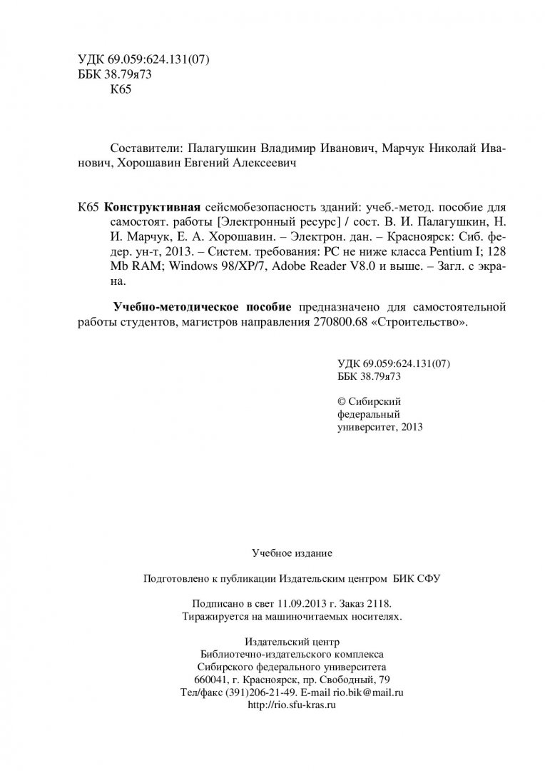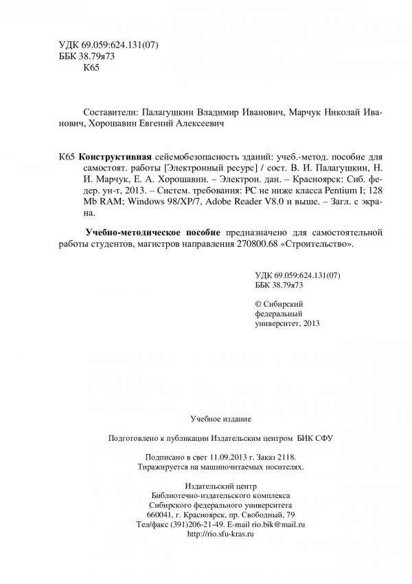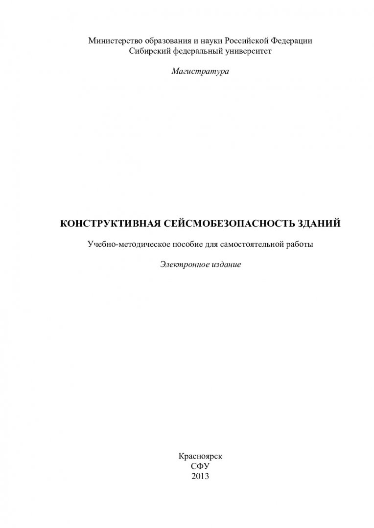 Библиографическое описание:Конструктивная сейсмобезопасность зданий : учебно-методическое пособие для самостоятельной работы [для студентов напр. 270800.68 «Строительство»] / Сиб. федерал. ун-т ; сост.: В. И. Палагушкин, Н. И. Марчук, Е. А. Хорошавин. - Электрон. текстовые дан. (PDF, 4,6 Мб). - Красноярск : СФУ, 2013. - (Магистратура). - Загл. с титул. экрана. - Библиогр.: с. 31-32. - Изд. № 2013-2118. - Текст : электронный.