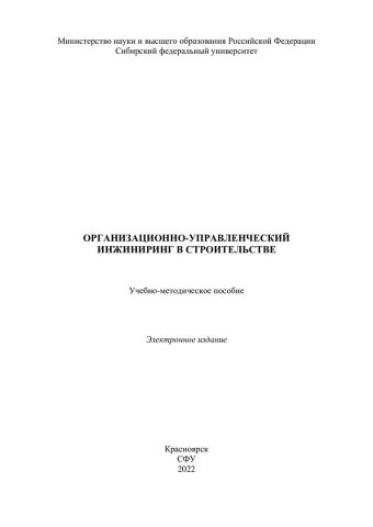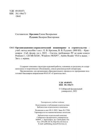 Библиографическое описание:Организационно-управленческий инжиниринг в строительстве : учебно-методическое пособие / Сиб. федер. ун-т, Инж.-строит. ин-т ; сост.: Е. В. Крелина, В. В. Рудских. - Электрон. текстовые дан. (pdf, 3 Мб). - Красноярск : СФУ, 2022 (2022-10-24). - 48 с. - Загл. с титул. экрана. - Изд. № 2022-17384 : Б. ц. - Текст : электронный.