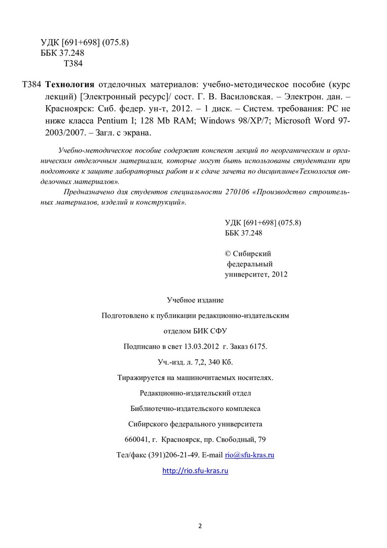 Библиографическое описание:Технология отделочных материалов : учеб.-метод. пособие (курс лекций) для студентов по спец. 270106 "Производство строит. материалов, изделий и конструкций" / Сиб. федерал. ун-т ; сост. Г. В. Василовская. - Электрон. текстовые дан. (PDF, 880 Кб). - Красноярск : СФУ, 2012. - Загл. с титул. экрана. - Библиогр.: с. 122-125. - Текст : электронный.