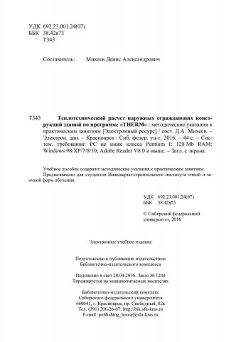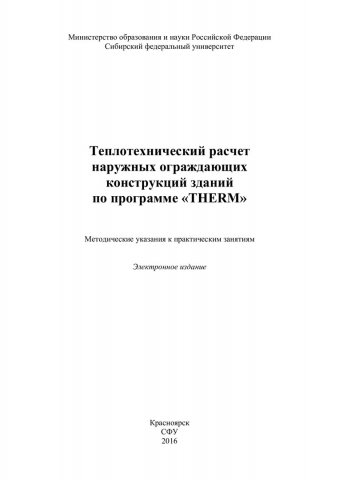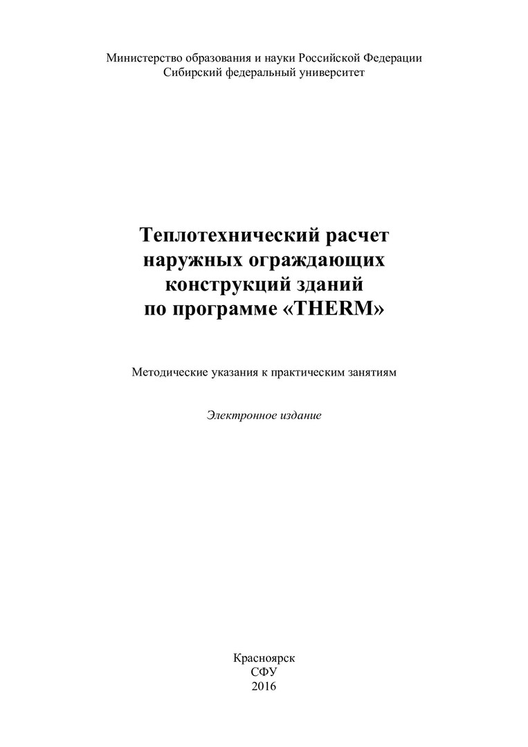 Теплотехнический расчет наружных ограждающих конструкций по программе "THERM" : методические указания к практическим занятиям [для студентов Инженерно-строительного института] / Сиб. федер. ун-т, Инж.-строит. ин-т ; сост. Д. А. Михеев. - Электрон. текстовые дан. (pdf, 1,17 Мб). - Красноярск : СФУ, 2016. - Загл. с титул. экрана. - Библиогр.: с. 43. - Изд. № 2016-1244 : Б. ц. - Текст : электронный.