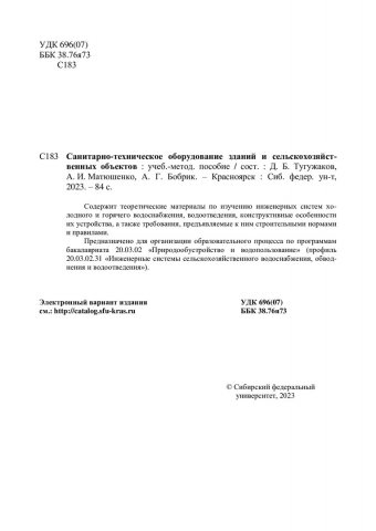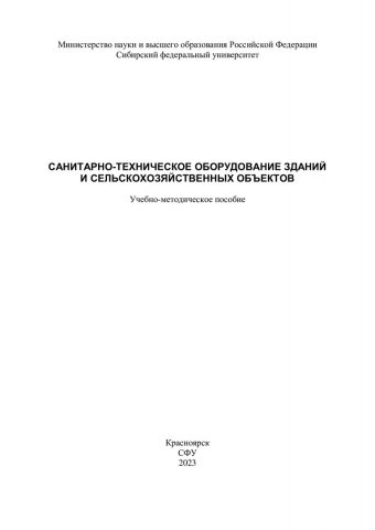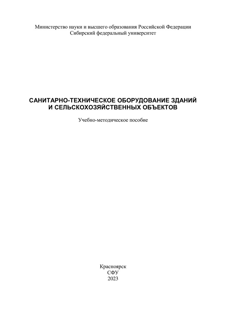 Библиографическое описание: Санитарно-техническое оборудование зданий и сельскохозяйственных объектов : учебно-методическое пособие / Сибирский федеральный университет, Инженерно-строительный институт ; сост.: Д. Б. Тугужаков, А. И. Матюшенко, А. Г. Бобрик. - Электрон. текстовые дан. (2,1 Мб). - Красноярск : СФУ, 2023 (2023-02-20). - 84 с., 4.0 усл. печ. л. : ил. - Загл. с титул. экрана. - Электрон. версия печ. публикации . - Библиогр.: с. 82. - 100 экз. - Изд. № 2023-18244 : Б. ц. - Текст : электронный.