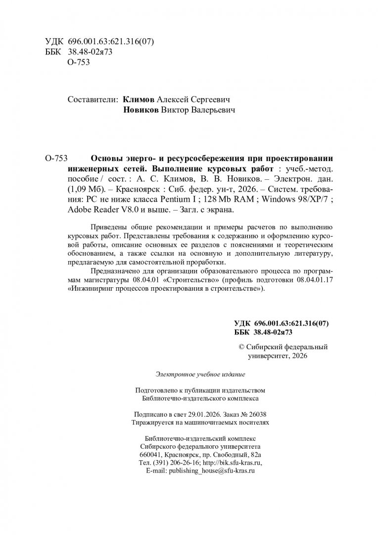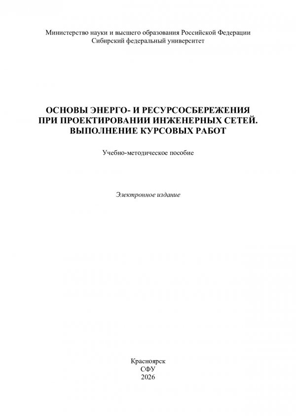 Библиографическое описание:Основы энерго- и ресурсосбережения при проектировании инженерных сетей. Выполнение курсовых работ : учебно-методическое пособие / Сиб. федер. ун-т, Инж.-строит. ин-т ; сост.: А. С. Климов, В. В. Новиков. - Электрон. текстовые дан. (pdf 1.2 Мб.). - Красноярск : СФУ, 2026 (2026-01-29). - 38 с. - Загл. с титул. экрана. - Изд. № 2026-26038 : Б. ц. - Текст : электронный.