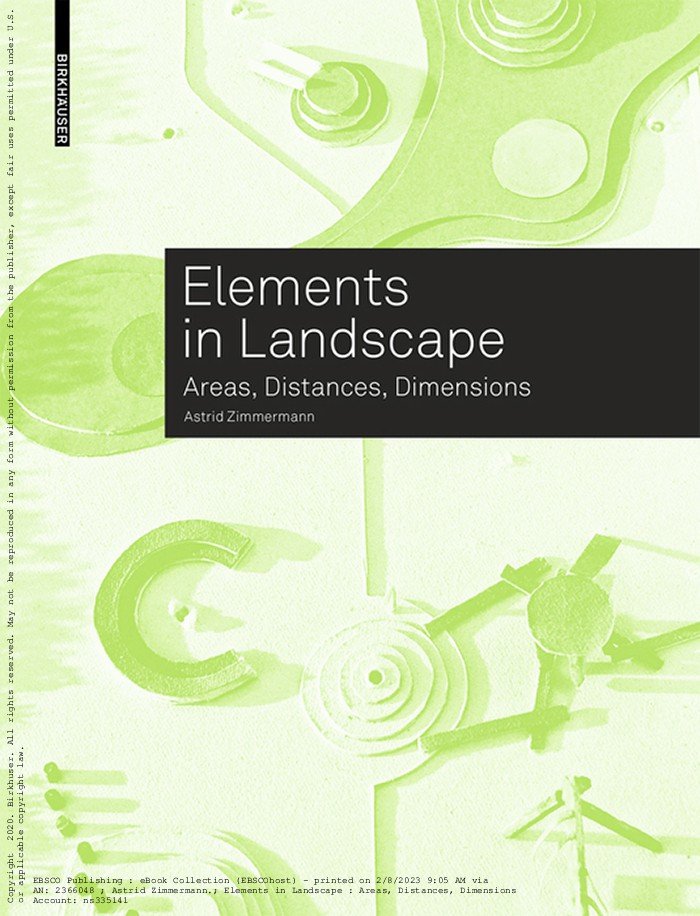 Библиографическое описание:Zimmermann, Astrid. Elements in landscape: areas, distances, dimensions / Astrid Zimmermann. - Электрон. текстовые дан. - 1515/9783035621044. - [S. l. : s. n.], 2020. - 1 online resource (176 pages). - Загл. с титул. экрана. - In English. - Includes bibliographical references (pages 155-158) and index. - ISBN 9783035621044. - ISBN 3035621047 : Б. ц. - Текст : электронный. Перевод заглавия: Элементы ландшафта: площади, расстояния, размеры Примечания о происхождении: Коллекция цифровых книг Ebsco ebook (централизованная подписка 2023 г., бессрочный доступ)., НБ СФУ