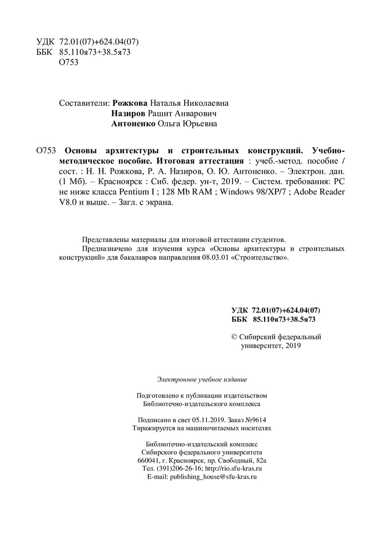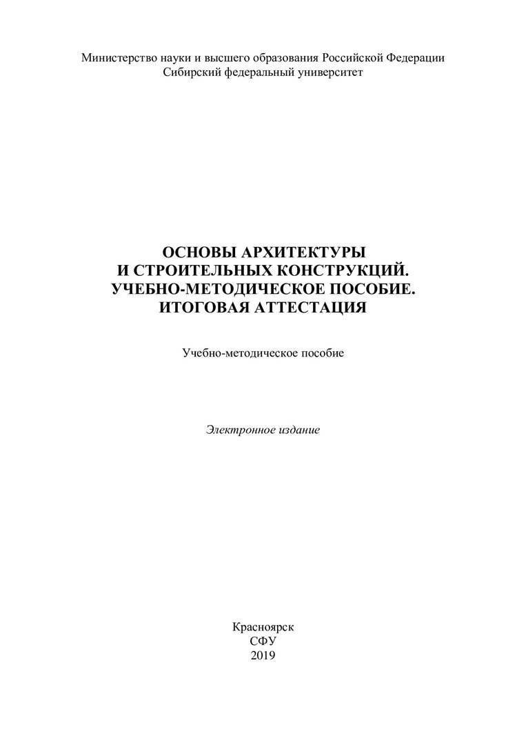 Библиографическое описание:Основы архитектуры и строительных конструкций. Учебно-методическое пособие. Итоговая аттестация. : учебно-методическое пособие / Сиб. федер. ун-т, Инж.-строит. ин-т ; сост.: Н. Н. Рожкова, Р. А. Назиров, О. Ю. Антоненко. - Электрон. текстовые дан. (pdf, 1 Мб). - Красноярск : СФУ, 2019. - Загл. с титул. экрана. - Изд. № 2019-9614 : Б. ц. - Текст : непосредственный.