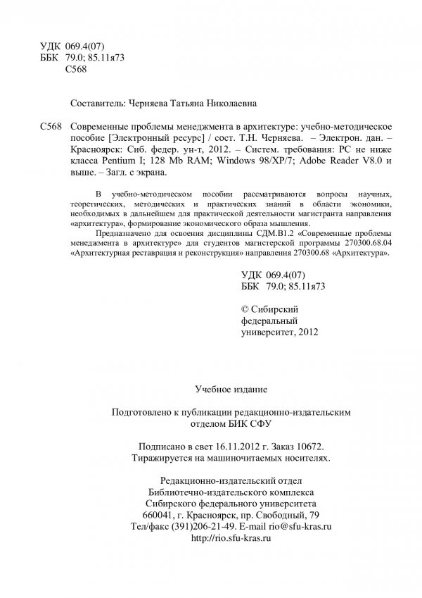 Библиографическое описание:Современные проблемы менеджмента в архитектуре : учебно-методическое пособие [для студентов программы 270300.68.04 «Архитектурная реставрация и реконструкция»] / Сиб. федерал. ун-т ; сост. Т. Н. Черняева. - Электрон. текстовые дан. (PDF, 267 Кб). - Красноярск : СФУ, 2012. - Загл. с титул. экрана. - Библиогр.: с. 10-14. - Текст : электронный.
