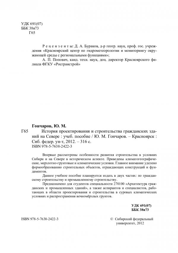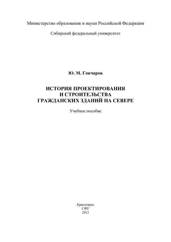 Библиографическое описание:Гончаров, Юрий Михайлович. История проектирования и строительства гражданских зданий на Севере : учебное пособие для студентов вузов спец. 270100 "Архитектура гражданских и промышленных зданий" / Ю. М. Гончаров ; Сиб. федерал. ун-т. - Красноярск : СФУ, 2012. - 314 с. : граф., ил., табл., схем. - Библиогр.: с. 304-310. - ISBN 978-5-7638-2422-3. - Текст : непосредственный + Текст : электронный.