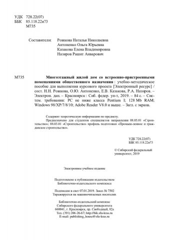Библиографическое описание:Многоэтажный жилой дом со встроенно-пристроенными помещениями общественного назначения : учебно-методическое пособие / Сиб. федер. ун-т, Инж.-строит. ин-т ; сост. Н. Н. Рожкова [и др.]. - Электрон. текстовые дан. (pdf, 1,7 Мб). - Красноярск : СФУ, 2019. - Загл. с титул. экрана. - Библиогр.: с. 81-84. - Изд. № 2018-7502 : Б. ц. - Текст : непосредственный.