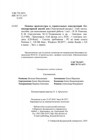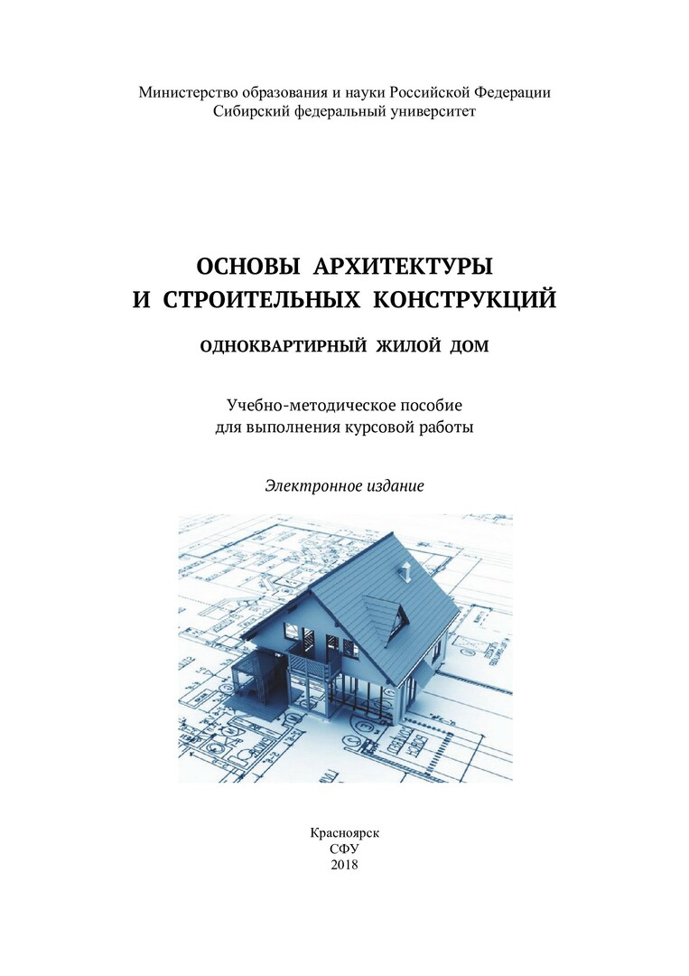 Библиографическое описание:Основы архитектуры и строительных конструкций. Одноквартирный жилой дом : учебно-методическое пособие для выполнения курсовой работы / Сиб. федер. ун-т, Инж.-строит. ин-т ; сост. Н. Н. Рожкова [и др.]. - Электрон. текстовые дан. (pdf, 3,5 Мб). - Красноярск : СФУ, 2018. - Загл. с титул. экрана. - Библиогр.: с. 48-50. - Изд. № 2018-5537 : Б. ц. - Текст : непосредственный.