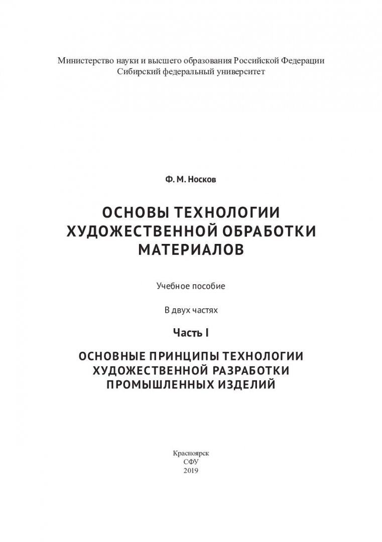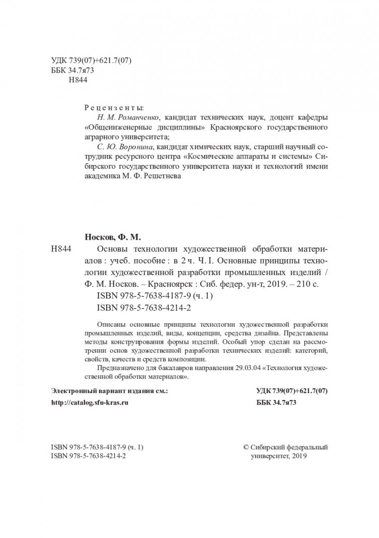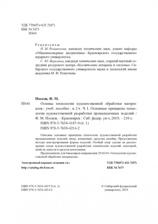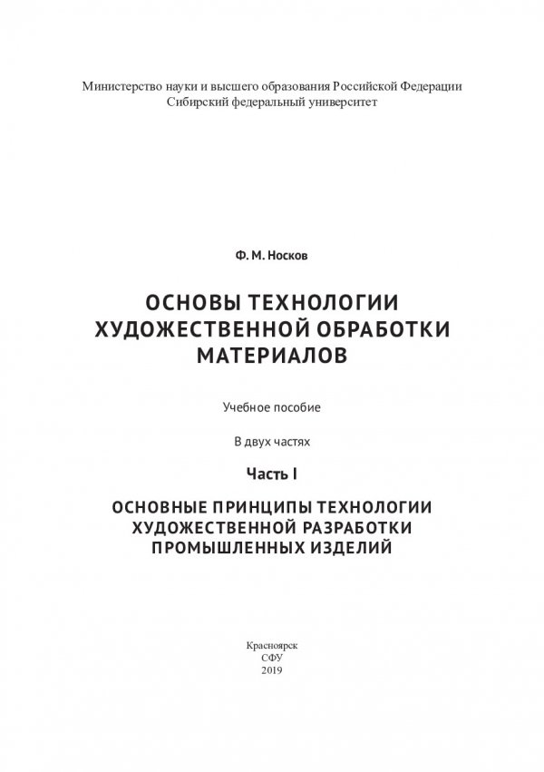 Библиографическое описание:Носков, Федор Михайлович. Основы технологии художественной обработки материалов [Текст] : учебное пособие : в 2-х ч. / Ф. М. Носков ; М-во науки и высш. образования Рос. Федер., Сиб. федер. ун-т, Политехн. ин-т. - Красноярск : СФУ. - Текст : непосредственный. + Текст : электронный. Ч. 1 : Основные принципы технологии художественной разработки промышленных изделий. - 2019 (2019-10-22). - 209 с. : цв. ил., рис. - Библиогр.: с. 180. - 100 экз. - ISBN 978-5-7638-4214-2 : 469.00 р. - Изд. № 2019-9213