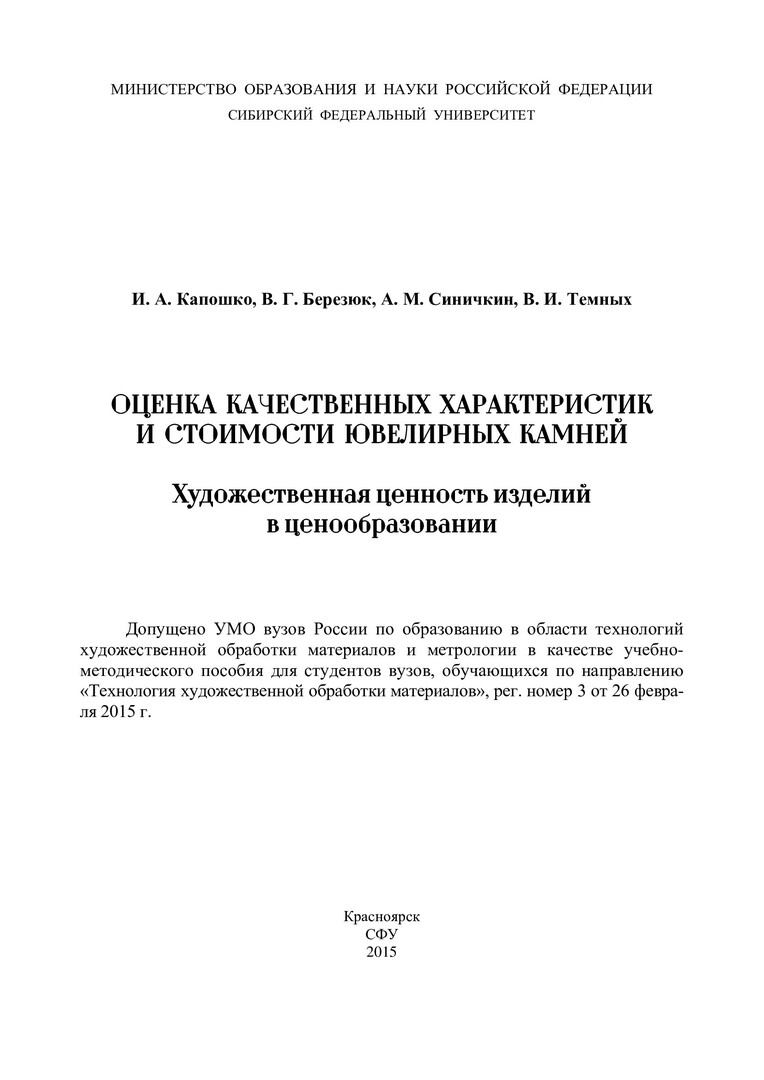 Библиографическое описание:Оценка качественных характеристик и стоимости ювелирных камней. Художественная ценность изделий в ценообразовании : учебное пособие для студентов вузов, обучающихся по направлению "Технология художественной обработки материалов" / И. А. Капошко [и др.] ; Сиб. федер. ун-т, Политехн. ин-т. - Красноярск : СФУ, 2015. - 123 с. : цв. ил. - Библиогр.: с. 121-122. - 100 экз. - ISBN 978-5-7638-3328-7 : 191.00 р. - Изд. № 2015-2811. - Текст : непосредственный + Текст : электронный.