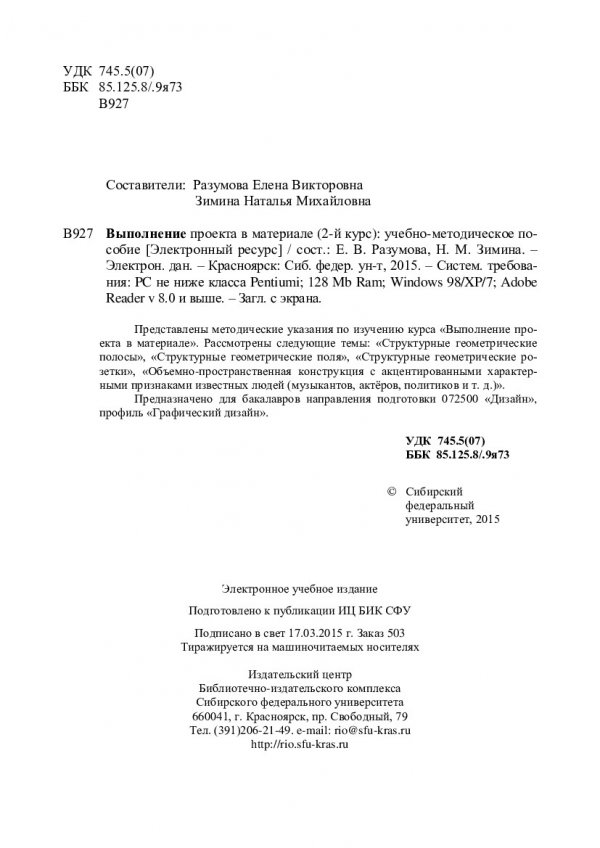 Библиографическое описание:Выполнение проекта в материале (2-й курс) : учебно-методическое пособие [для бакалавров напр. подг. 072500 «Дизайн», профиль «Графический дизайн»] / Сиб. федер. ун-т, Ин-т архитектуры и дизайна ; сост.: Е. В. Разумова, Н. М. Зимина. - Электрон. текстовые дан. (PDF, 1 Мб). - Красноярск : СФУ, 2015. - Загл. с титул. экрана. - Библиогр.: с. 15. - Изд. № 2015-503. - Текст : электронный.