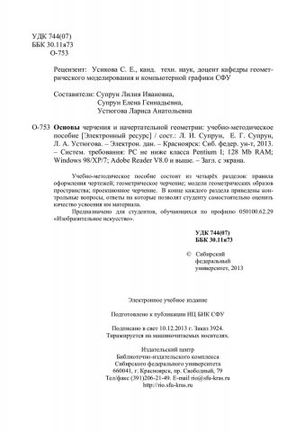 Библиографическое описание:Основы черчения и начертательной геометрии : учебно-методическое пособие [для студентов профиля подготовки 050100.62.29 «Изобразительное искусство»] / Сиб. федер. ун-т, Ин-т архитектуры и дизайна ; сост.: Л. И. Супрун, Е. Г. Супрун, Л. А. Устюгова. - Электрон. текстовые дан. (PDF, 13,1 Мб). - Красноярск : СФУ, 2013. - Загл. с титул. экрана. - Библиогр.: с. 132. - Изд. № 2013-3924. - Текст : непосредственный.