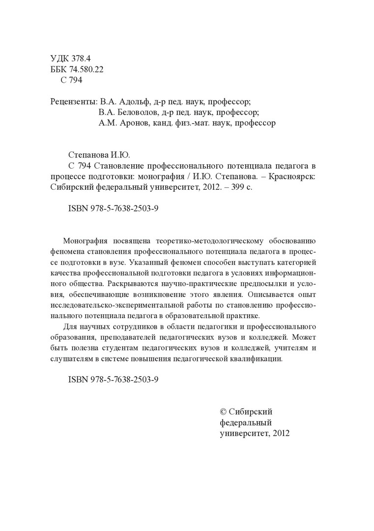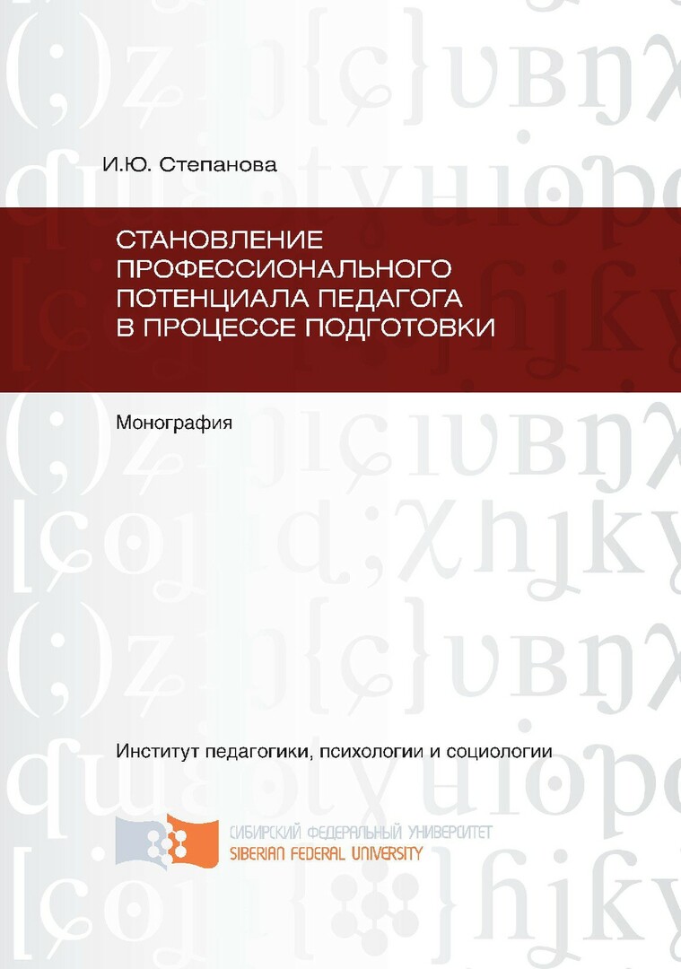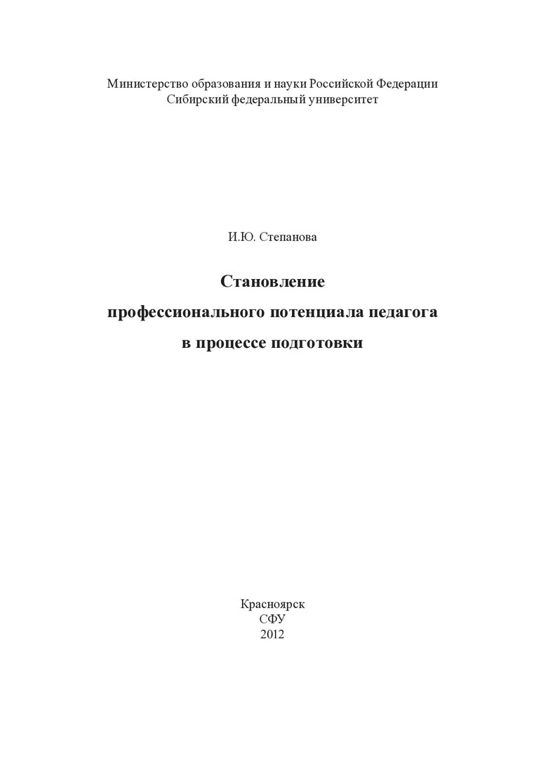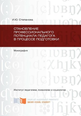 Библиографическое описание: Степанова, Инга Юрьевна. Становление профессионального потенциала педагога в процессе подготовки : монография / И. Ю. Степанова ; Сиб. федер. ун-т, Ин-т педагогики, психологии и социологии. - Красноярск : СФУ, 2012. - 399 с. - Библиогр.: с. 283-314. - ISBN 978-5-7638-2057-7 : 299.00 р. - Текст : непосредственный + Текст : электронный. Прилож.: с. 315-398