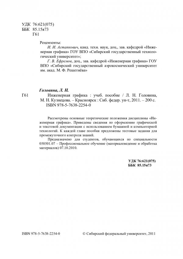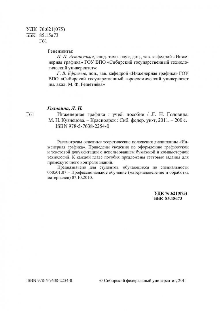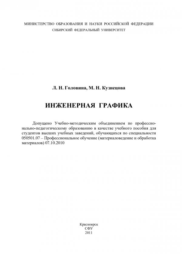 Библиографическое описание: Головина, Людмила Николаевна. Инженерная графика : учебное пособие для студентов вузов / Л. Н. Головина, М. Н. Кузнецова ; Сиб. федер. ун-т, Ин-т педагогики, психологии и социологии. - Красноярск : ИПК СФУ, 2011. - 198 с. : ил. - (Лучшие учебники СФУ). - Библиогр.: с. 196. - 200 экз. - ISBN 978-5-7638-2254-0 : 115.50 р. - Текст : непосредственный + Текст : электронный.