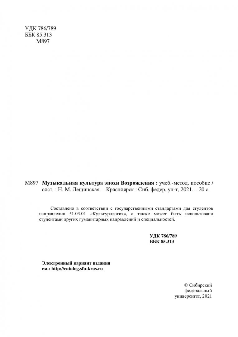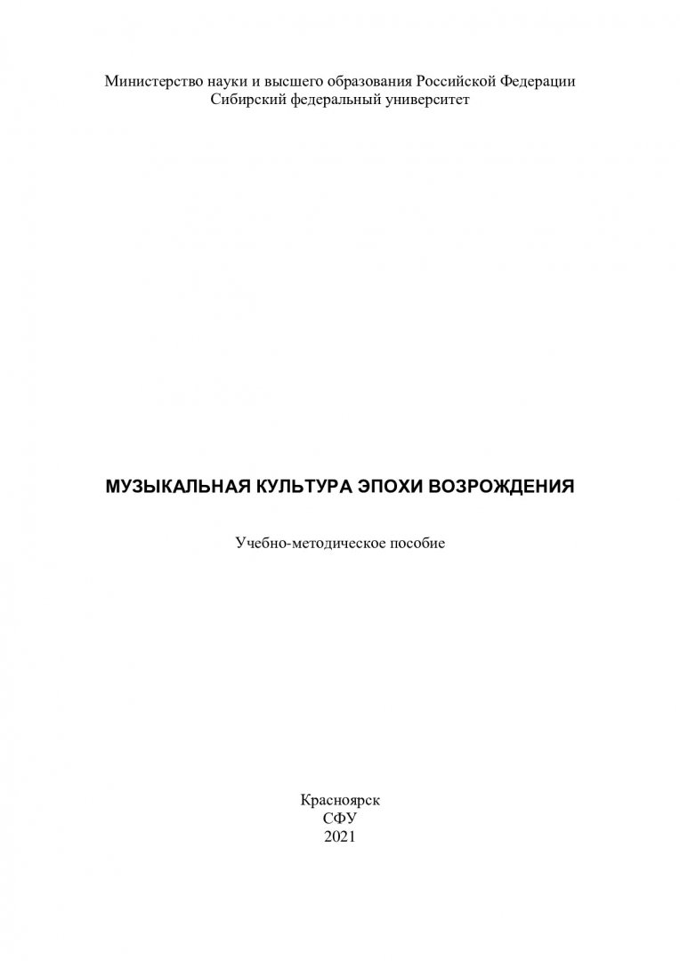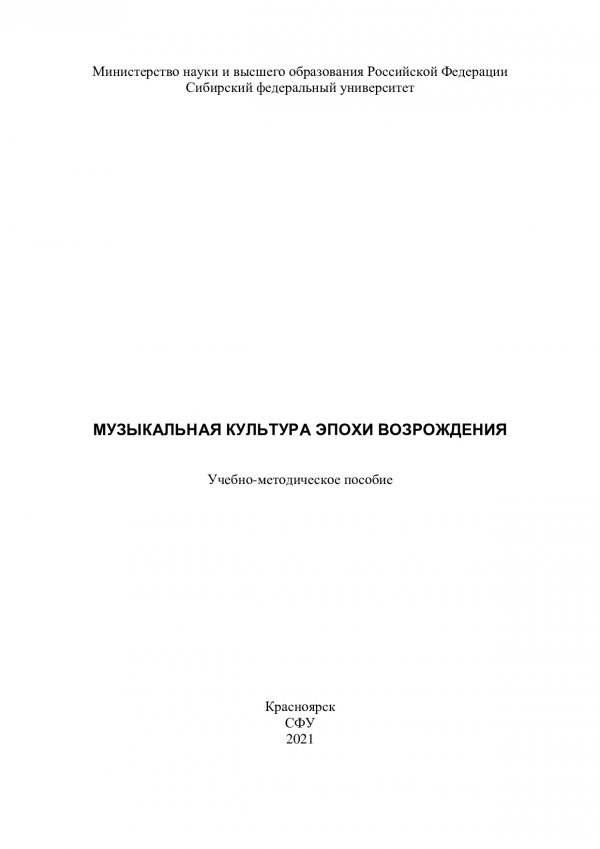 Библиографическое описание:Музыкальная культура эпохи Возрождения : учебно-методическое пособие / Сиб. федер. ун-т, Гуманитар. ин-т ; сост. Н. М. Лещинская. - Красноярск : СФУ, 2021 (2021-02-25). - 20 с. - 100 экз. - Изд. № 2021-13069 : 37.00 р. - Текст : непосредственный : электронный.