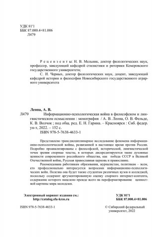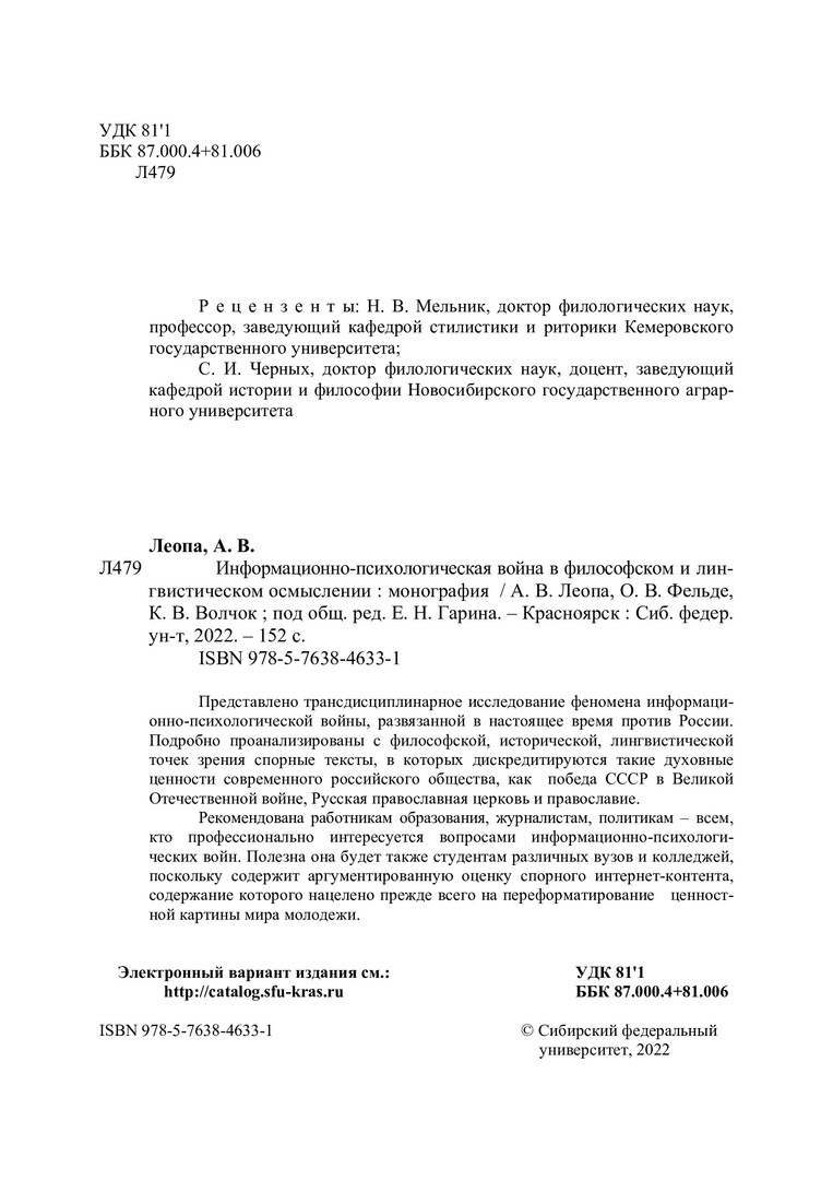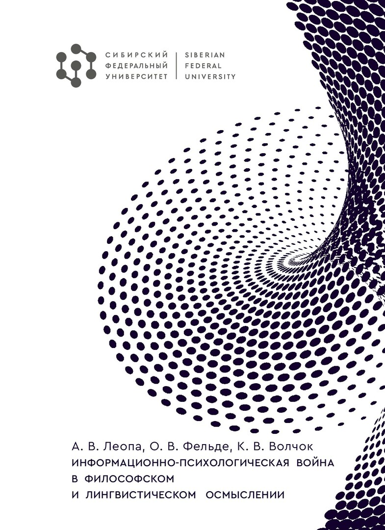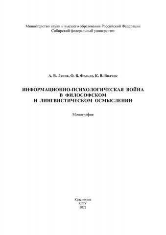 Библиографическое описание: Леопа, Александр Владимирович. Информационно-психологическая война в философском и лингвистическом осмыслении : монография / А. В. Леопа, О. В. Фельде, К. В. Волчок ; рец.: Н. В. Мельник, С. И. Черных ; Сибирский федеральный университет, Военно-инженерный институт. - Красноярск : СФУ, 2022 (2022-08-08). - 152 с., 9.5 усл. печ. л. : цв. ил. - Библиогр.: с. 132-147. - 500 экз. - ISBN 978-5-7638-4633-1 : 457.00 р. - Изд. № 2022-15490. - Текст : непосредственный : электронный.
